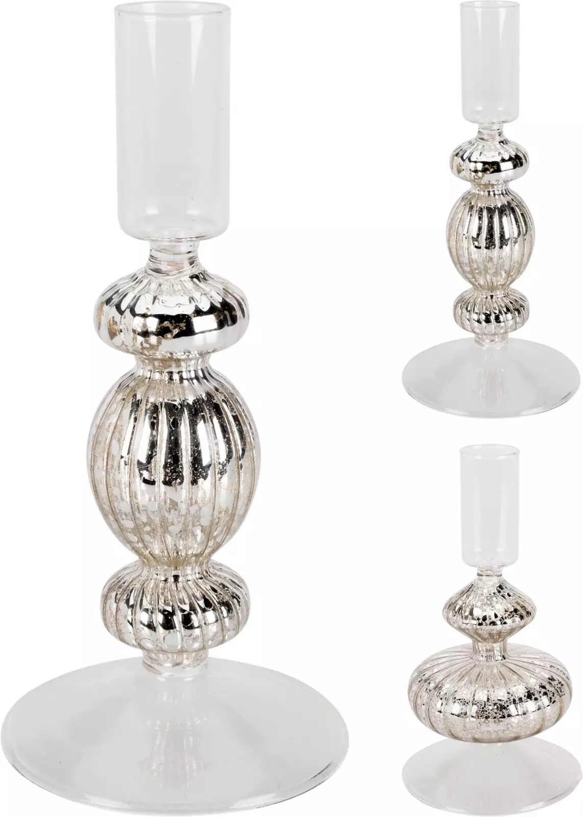 Denna eleganta glasljusstake ger en touch av gammaldags prakt till vilket utrymme som helst. Dess antika guldfinish reflekterar ljuset från ljus på ett vackert sätt och skapar en varm atmosfär. Ljusstaken finns tillgänglig i två olika former, vilket möjliggör personliga inredningslösningar.