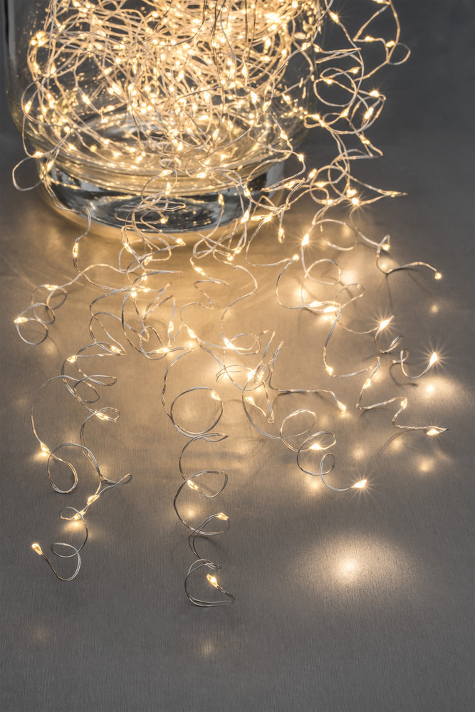 Silverfärgad ljus trådgrupp, kan böjas i olika former. Led varmgul (kedjor: 5 x 20 lysdioder, 10 x 10 lysdioder), ej utbytbara, ansluten till en serie med 10 lysdioder. Material tunn metalltråd. Sladd klar.