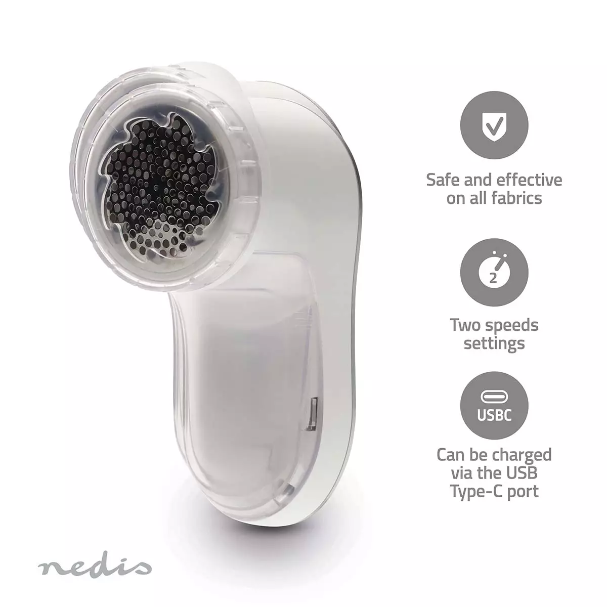 Se till att dina kläder och textilier ser nya ut med Nedis luddborttagare. Den här enheten är utformad för att effektivt avlägsna ludd, fnöske och tygpiller från plagg, klädsel och filtar och är en praktisk lösning för att upprätthålla ett snyggt utseende. Den stora bladytan och det ergonomiska handtaget gör att du kan täcka större områden på ett bekvämt och effektivt sätt. Höghastighetsbladet arbetar med upp till 7700 varv per minut och säkerställer snabb och grundlig borttagning av oönskade tygansamlingar. Luddborttagaren har två hastighetsinställningar, så att du kan justera intensiteten för olika typer av material - perfekt för allt från tjocka stickade tyger till ömtåliga tyger. Behållaren som samlar upp borttagna piller är lätt att ta loss och tömma, vilket gör underhållet snabbt och smidigt. Ett genomtänkt utformat nätöverdrag har olika hålstorlekar för att hantera piller av olika dimensioner. För extra försiktighet på fina plagg ingår ett höjdjusterbart lock som ger extra skydd under användning. Nedis Lint Remover drivs av ett integrerat 500 mAh litiumjonbatteri och är sladdlös och kan enkelt laddas med USB Type-C-porten. Detta gör den perfekt för användning hemma eller på resan. Oavsett om du fräschar upp din vintergarderob eller ger nytt liv åt dina hemtextilier ger den här mångsidiga luddborttagaren tillförlitliga resultat vid varje användning.