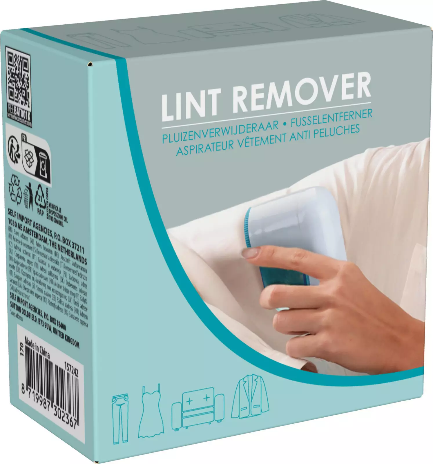 Noppborttagare: Effektiv och kompakt, vit ABS, blå PS-behållare. Storlek 75x35x80 mm, 65 g. Drivs av 2xAA-batterier (ingår ej).