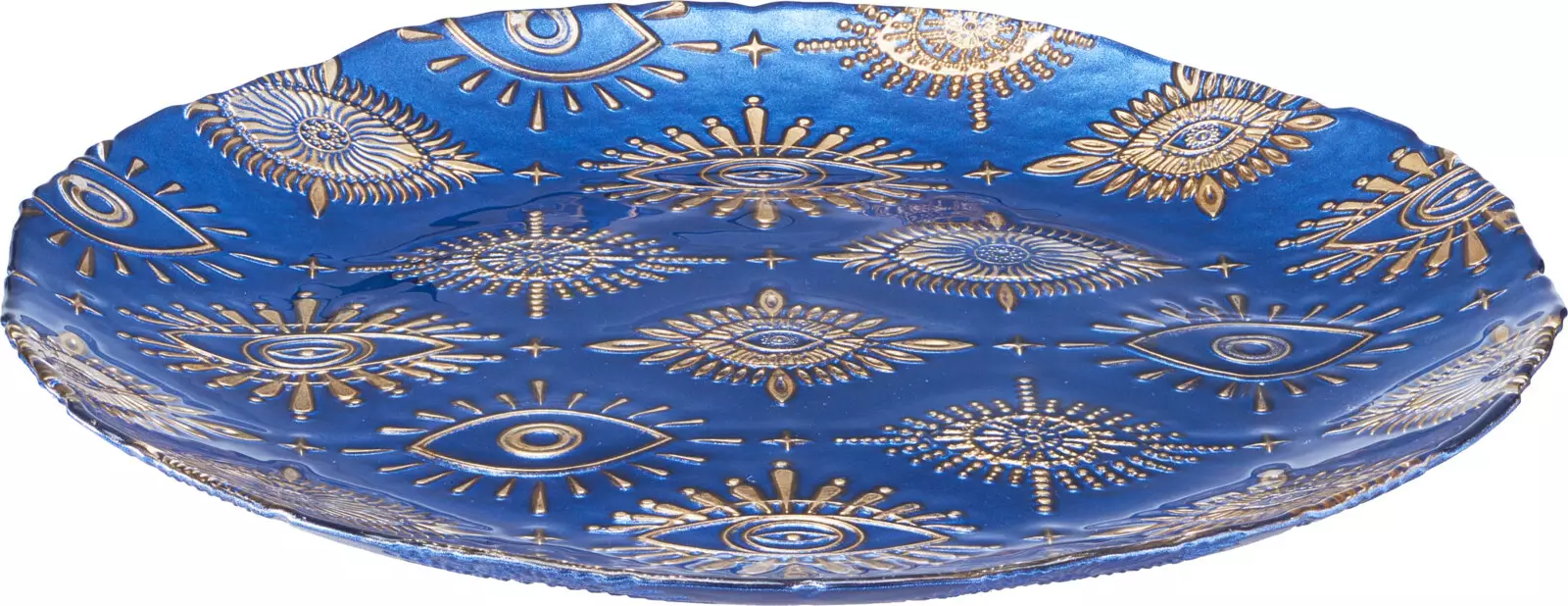 Ge din dukning en touch av lyx och mystik med detta fantastiska 28 cm navy blue glassfat. Den djupa blå basfärgen kombinerad med gyllene reliefmönstrade ögon- och stjärnmotiv gör detta fat till en imponerande blickfångare både till vardags och fest.
