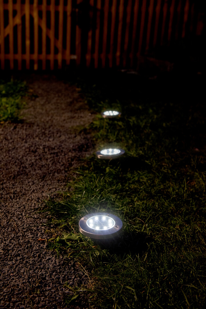 Markljus som drivs av en solcell, Ø 11,5 cm. Paketet innehåller tre markljus och separata 10,5 cm höga markspetsar. Vit led, 8 st/markljus. Material rostfritt stål och plast. Använd antingen på terrassen eller balkongen utan markspets, och med markspets, t.ex. i gårdens eller trädgårdens kantområden.
