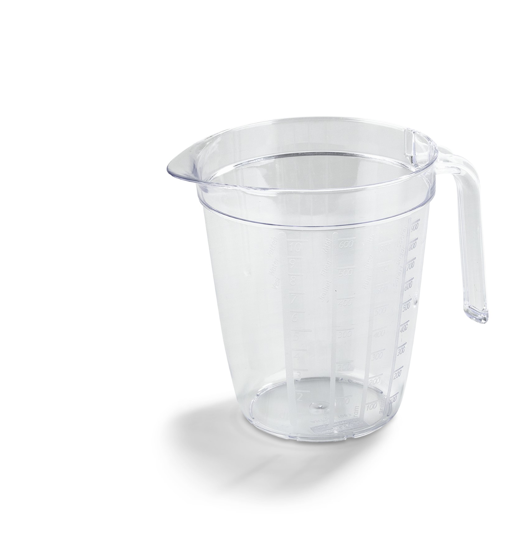 Måttkanna på 1L tillverkad av genomskinlig SAN-plast. Stegrad dl-skala och gramskala för mjöl, ris och socker. Kan maskindiskas.