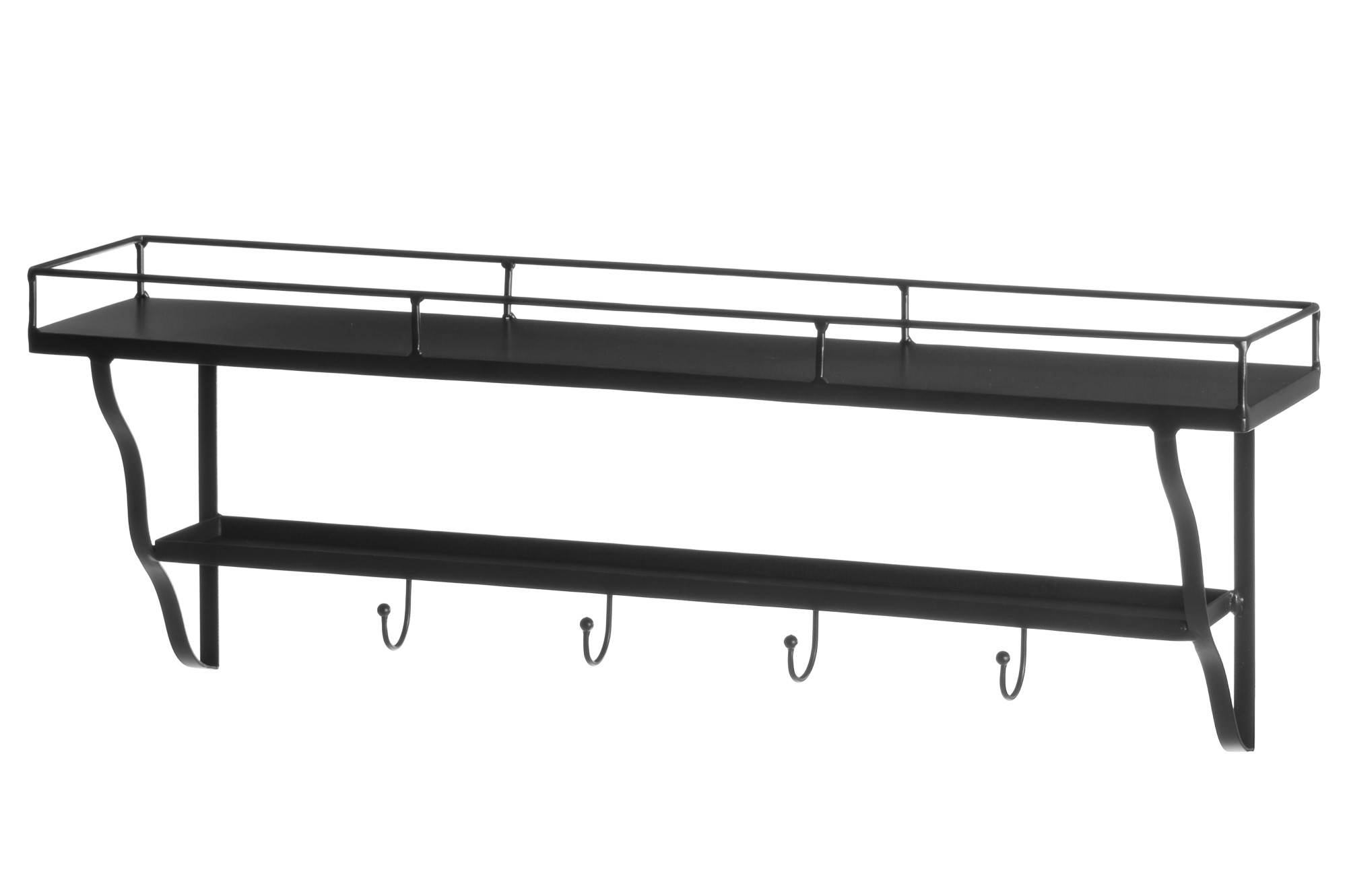 Snygg och praktisk metallhylla med två nivåer och hängkrokar. Den nedre nivån är smal. Hyllan är perfekt för att hålla ordning i till exempel hallen eller toaletten. Ser bra ut i köket också!