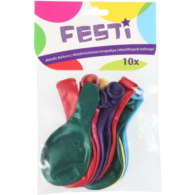 Metalliska luftballonger ger en festlig känsla till alla tillfällen, vare sig det är en födelsedag, Valborg eller annan fest. Förpackningen innehåller 10 stycken luftballonger tillverkade av naturgummi med en diameter på 26 cm. Dessa miljövänliga ballonger är hållbara och vackert glänsande, vilket ger glädje och färg till dina fester.