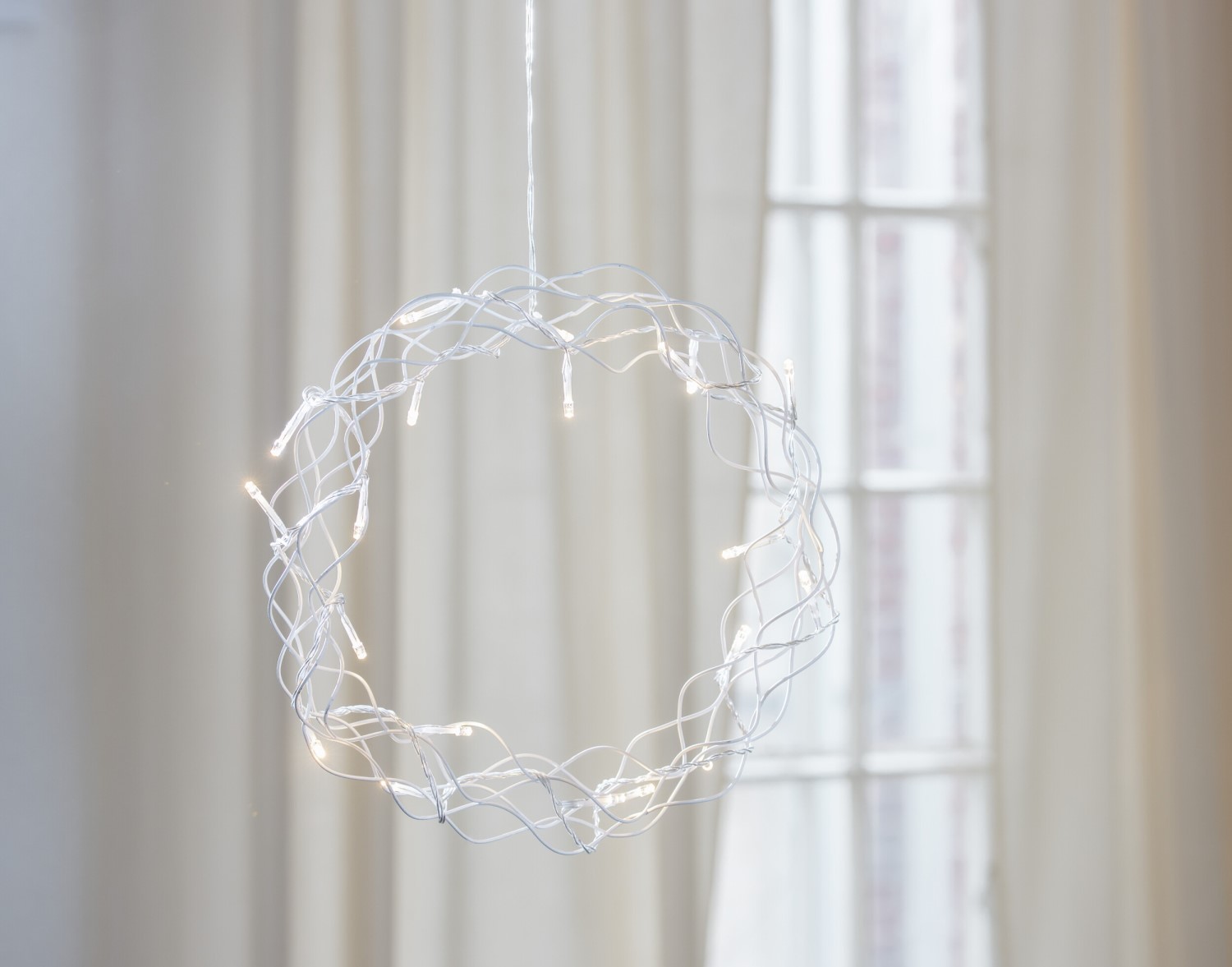 En stilig vit metallkrans med en LED-slinga runtom. Varmvita LED-lampor, ej utbytbara. Material: metall. Genomskinlig sladd.