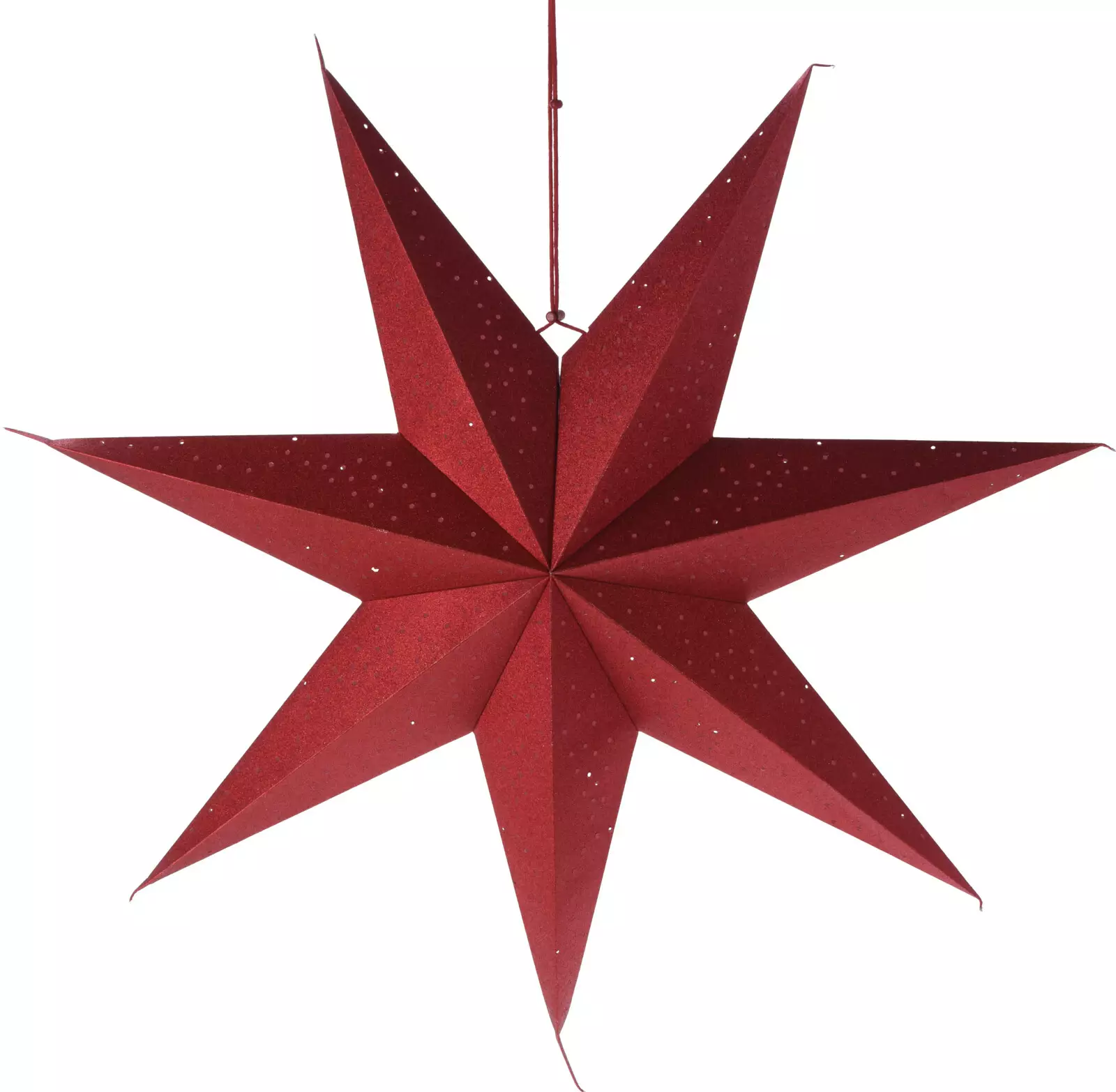 Vacker röd pappersstjärna med 7 armar och metallisk finish. Stjärnan är 75 x 16 x 75 cm stor och tillverkad av högkvalitativt 240 g/m² papper. Perfekt som dekoration i fönster eller festlokaler. Levereras i krympförpackning med bakstycke. FSC-certifierat material.