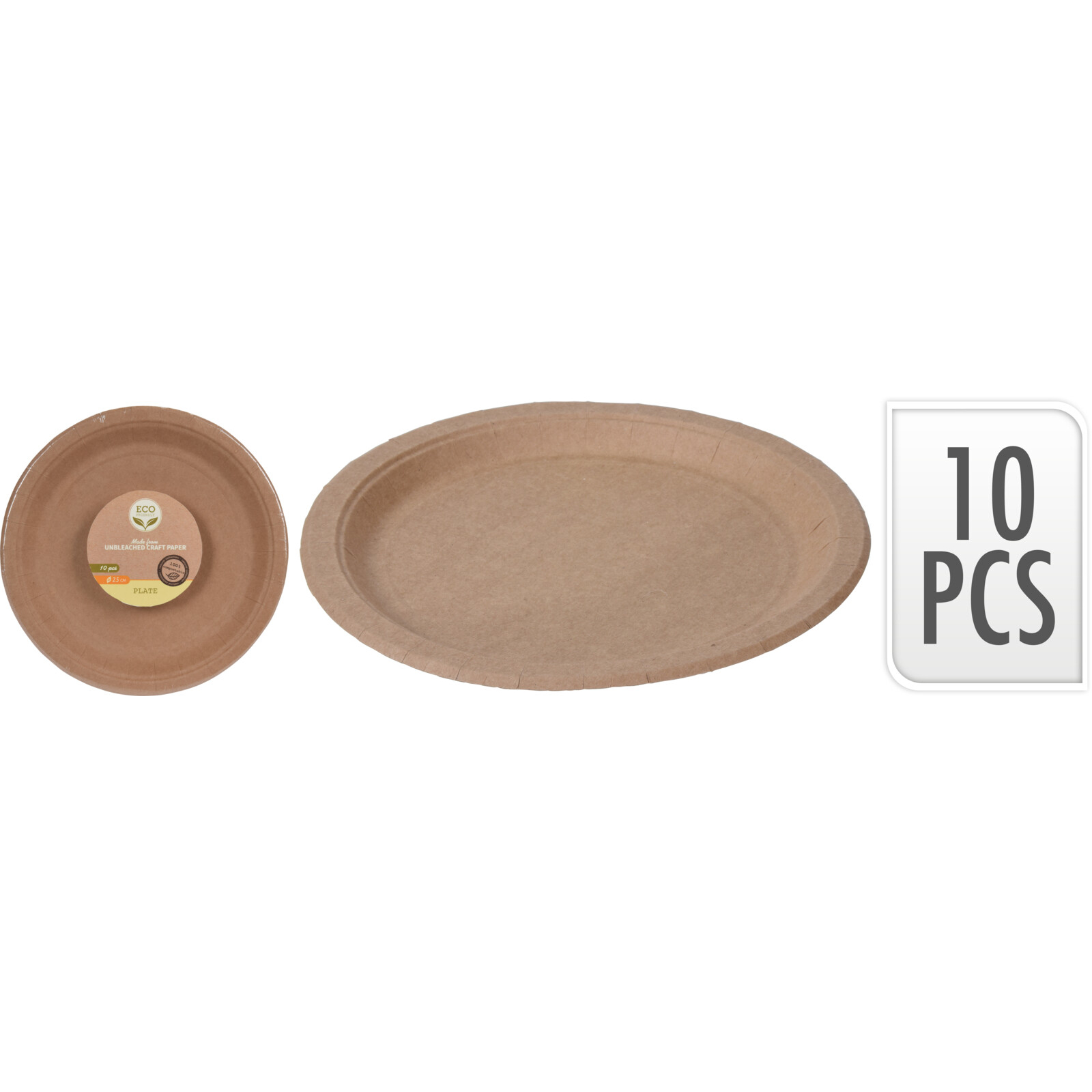 Detta set innehåller 10 stycken 225 mm papperstallrikar tillverkade av obehandlat kraftpapper, vilket gör dem till ett miljövänligt val. Varje tallrik väger 8 gram och levereras i en krympfilm med vår färgglada designetikett på framsidan och streckkodsetikett på botten. Denna förpackning är perfekt för evenemang, fester eller andra tillställningar där man önskar undvika engångsplast.
