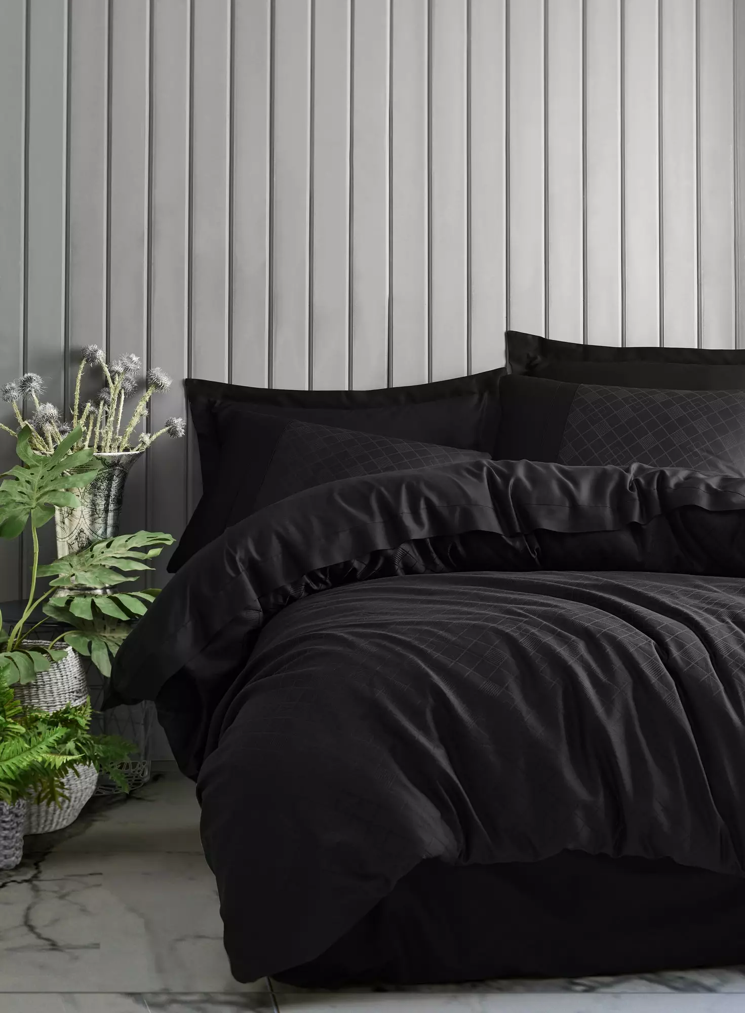Med sin eleganta jacquarddesign och eleganta svarta färg ger vårt set med överkast en touch av sofistikering till alla sovrumsinredningar. Den tidlösa skönheten i detta set kommer omedelbart att höja atmosfären i ditt utrymme och skapa en lugn och inbjudande atmosfär.