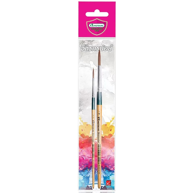 Detta set med två runda penslar erbjuder högkvalitativa verktyg för konstnärligt skapande. Penslarna (storlekar 5 och 9) är tillverkade av syntetfiber som absorberar vatten väl, vilket gör dem idealiska för akvarell och andra måleritekniker. Rostfria hylsor och lackade skaft som tål vatten säkerställer penslarnas långvariga hållbarhet. Detta set är särskilt lämpligt när du behöver större penslar för att täcka större ytor eller för att skapa breda penseldrag. Kom ihåg att rengöra penslarna noggrant efter användning beroende på vilken färg som har använts.