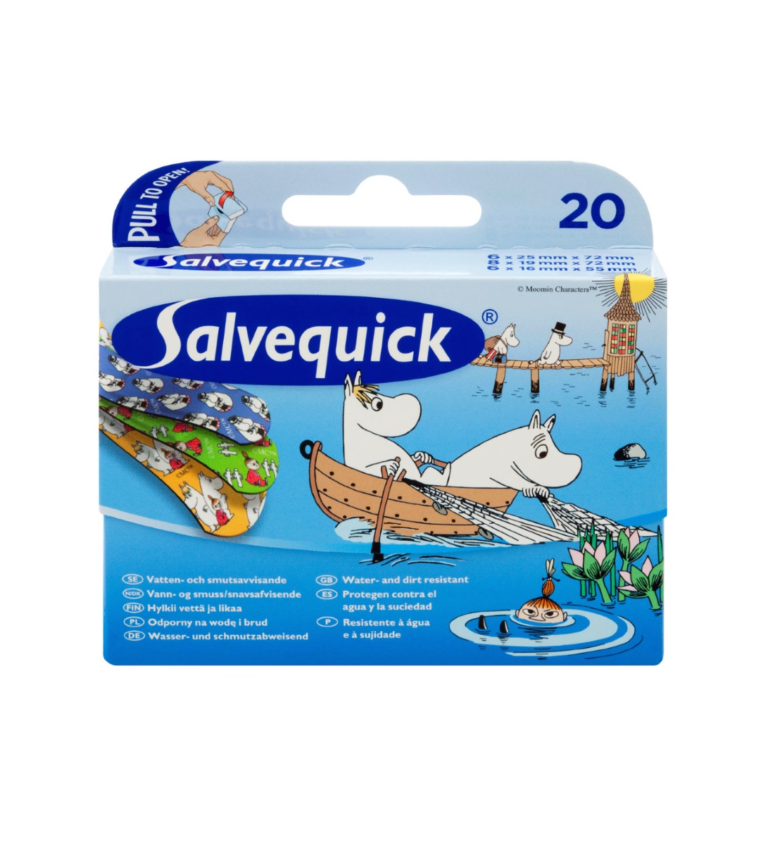 Mumin-barnplåstret skyddar mot vatten, smuts och tårar. Förpackningen kommer i tre olika mönster och tre storlekar.