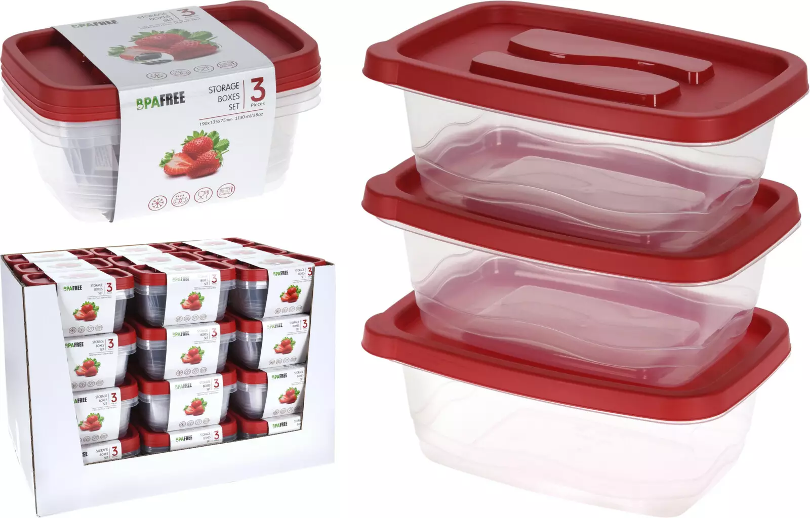 Set med tre plastförvaringslådor med röda lock. Lådorna är genomskinliga och tillverkade av BPA-fri polypropen. De är stapelbara och lämpliga för förvaring av livsmedel. Storlek: 190x135x75 mm, volym: 1130 ml. Lådorna tål mikrovågsugn, frys och diskmaskin. Varje set är förpackat i en färgglad ärmförpackning.