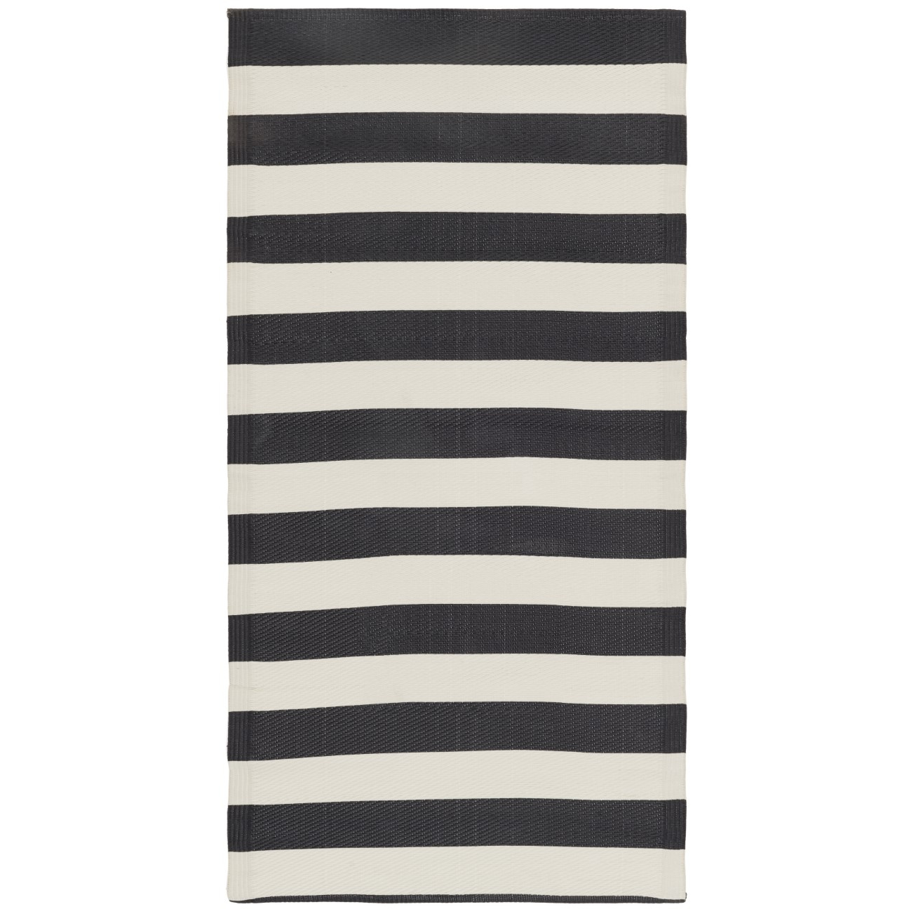 Lätt, utomhusanpassad plastmatta. Svart och vit randig. Material är 100 % polypropen. Rengörs med fuktig trasa.