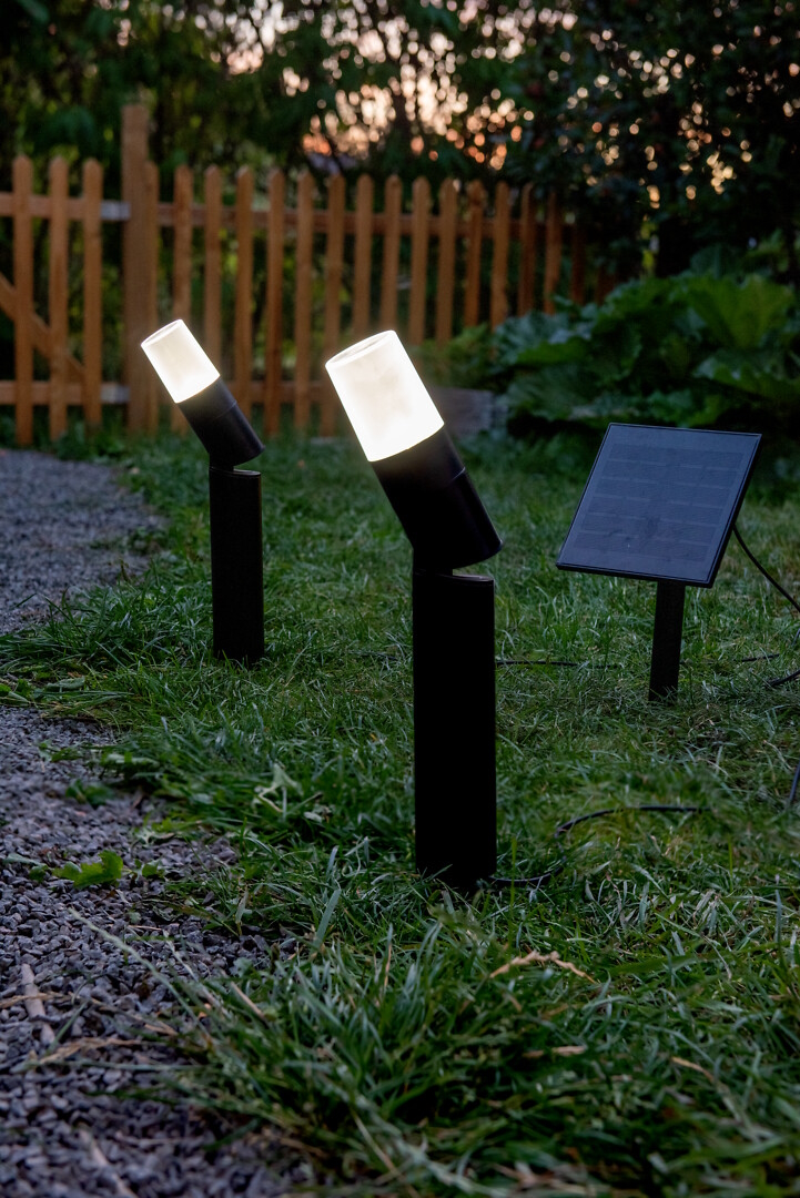 Setet innehåller två pollare och en separat solcellspanel. Solcellsanslutningskabel 5 m, jordspets ingår. Du kan påverka pollarens ljuseffekt genom att snabbt trycka på solcellens på/av-knapp: ljuseffekten ändras i tre steg (50 lm / 75 lm / 100 lm). Ett längre tryck (3 s) slår på eller av apparaten. Pollarhöjd 31 cm, kabel 1,5 m Pollarens topp kan böjas i steg (0° / 30° / 45° / 72°). Genom att ta bort lampskärmen kan du på ett smart sätt få en spotlight på din trädgård! Vit led, 1 st/pollare.