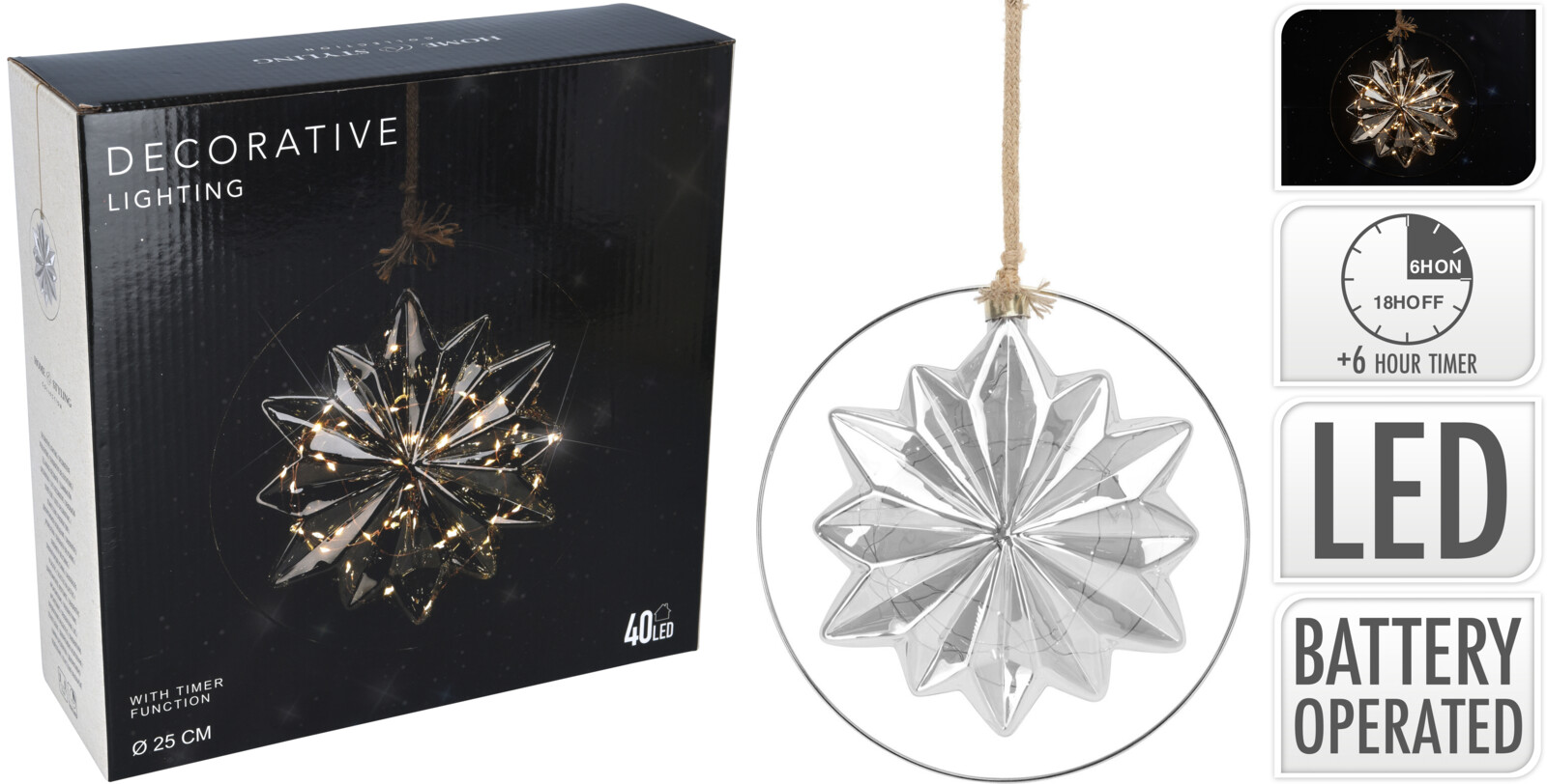 Vacker Star led i vacker glas-stjärna som är batteridriven. storlek: 18,5x8x21,5 cm, vikt: 210 gram, 40 stycken kopparfärgad metalltråd, avstånd mellan glödlampor 5 cm, svart metallring, diameter 26 cm, sladdlängd 80 cm, inkluderar timerfunktion, 3x AA-batterier ingår ej.