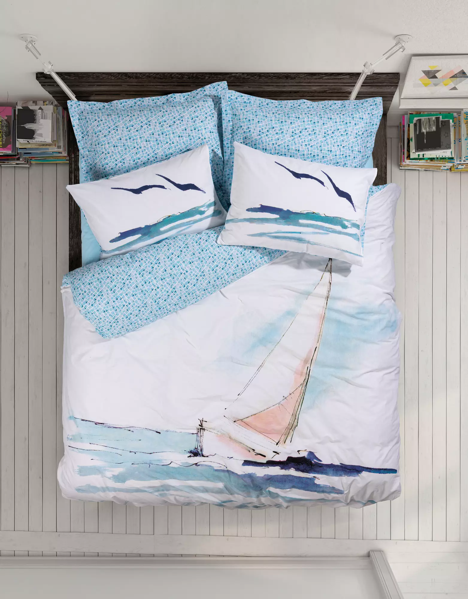 Med en vacker kombination av blå, vita och mörkblå färger ger vårt set med överkast en touch av sofistikering och elegans till alla sovrumsinredningar. Pigmenttryckstekniken som används i designen säkerställer livfulla och långvariga färger som kommer att förbättra den övergripande atmosfären i ditt rum.