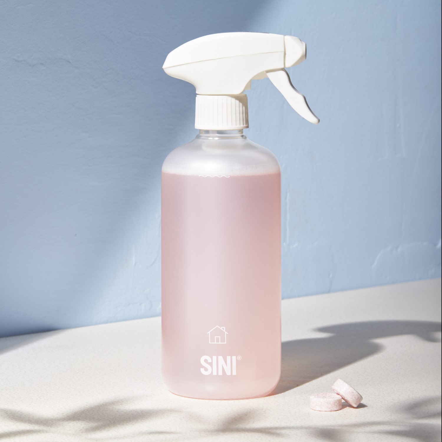 Fyll den vackra tåliga flaskan med vatten, släpp tabletten i flaskan så får du en flaska rengöringsmedel. Förpackningen innehåller totalt två flaskor med rengöringsmedel. Spraya på ytan som ska rengöras på ett avstånd av ca 20-30 cm och torka av med en fuktig trasa eller svamp.