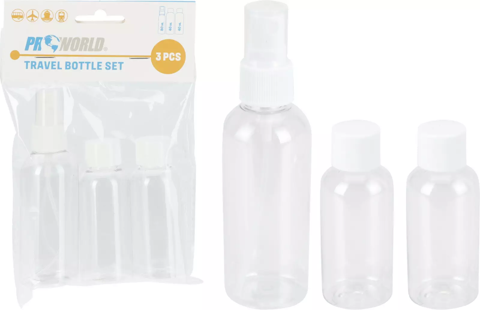 Ett set med tre reseflaskor innehåller en sprayflaska och två flaskor med skruvlock. Flaskorna är genomskinliga och tillverkade av hållbar PET-plast. Sprayflaskan har ett vitt sprayhuvud och flaskorna med skruvlock har vita lock. Setet är förpackat i en genomskinlig plastförpackning med upphängningshål. Perfekt för resor.