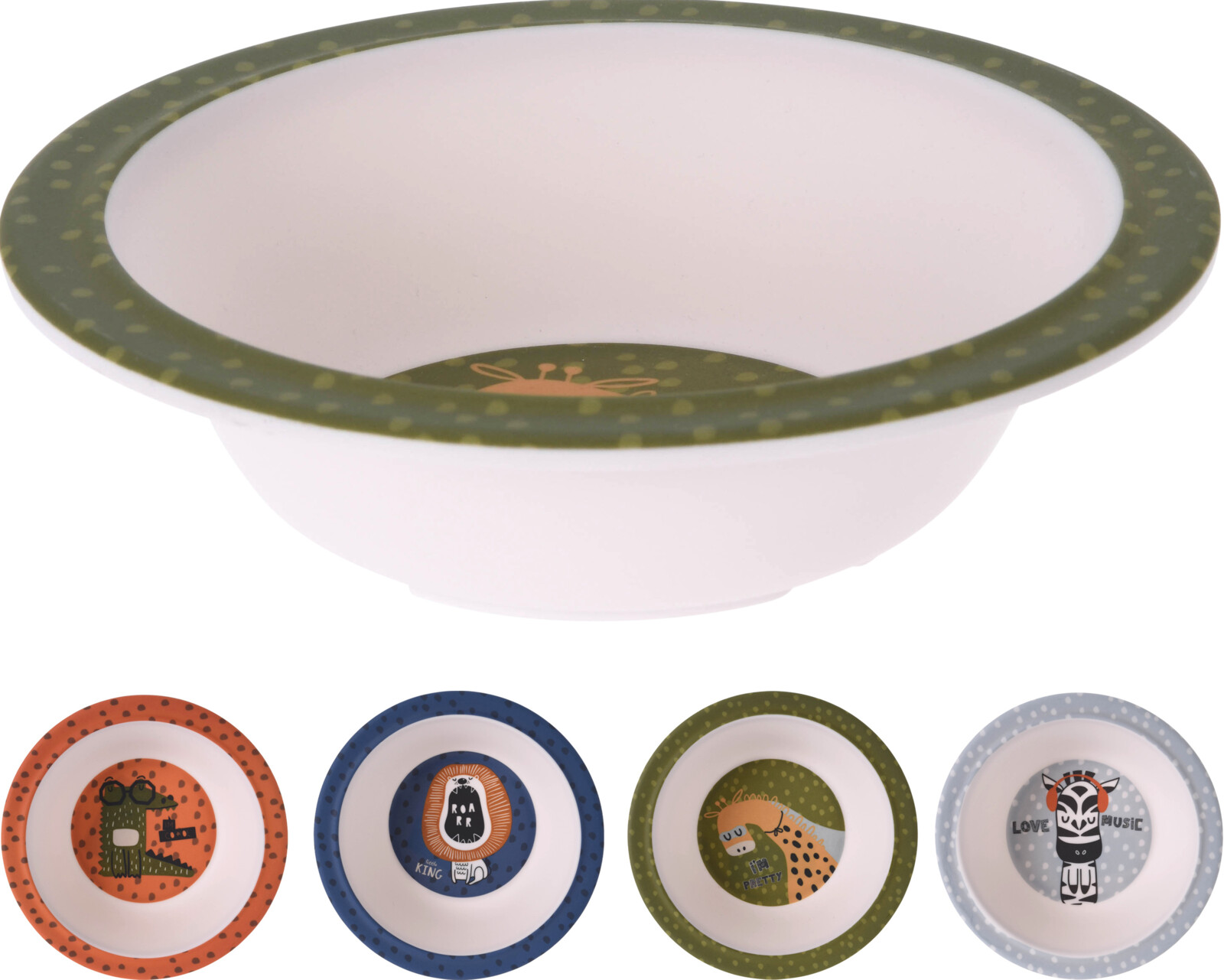 En skål gjord av melanin. Lätt, praktisk och estetisk, färgglad med djurtema. Perfekt för småbarn som lär sig att äta självständigt.