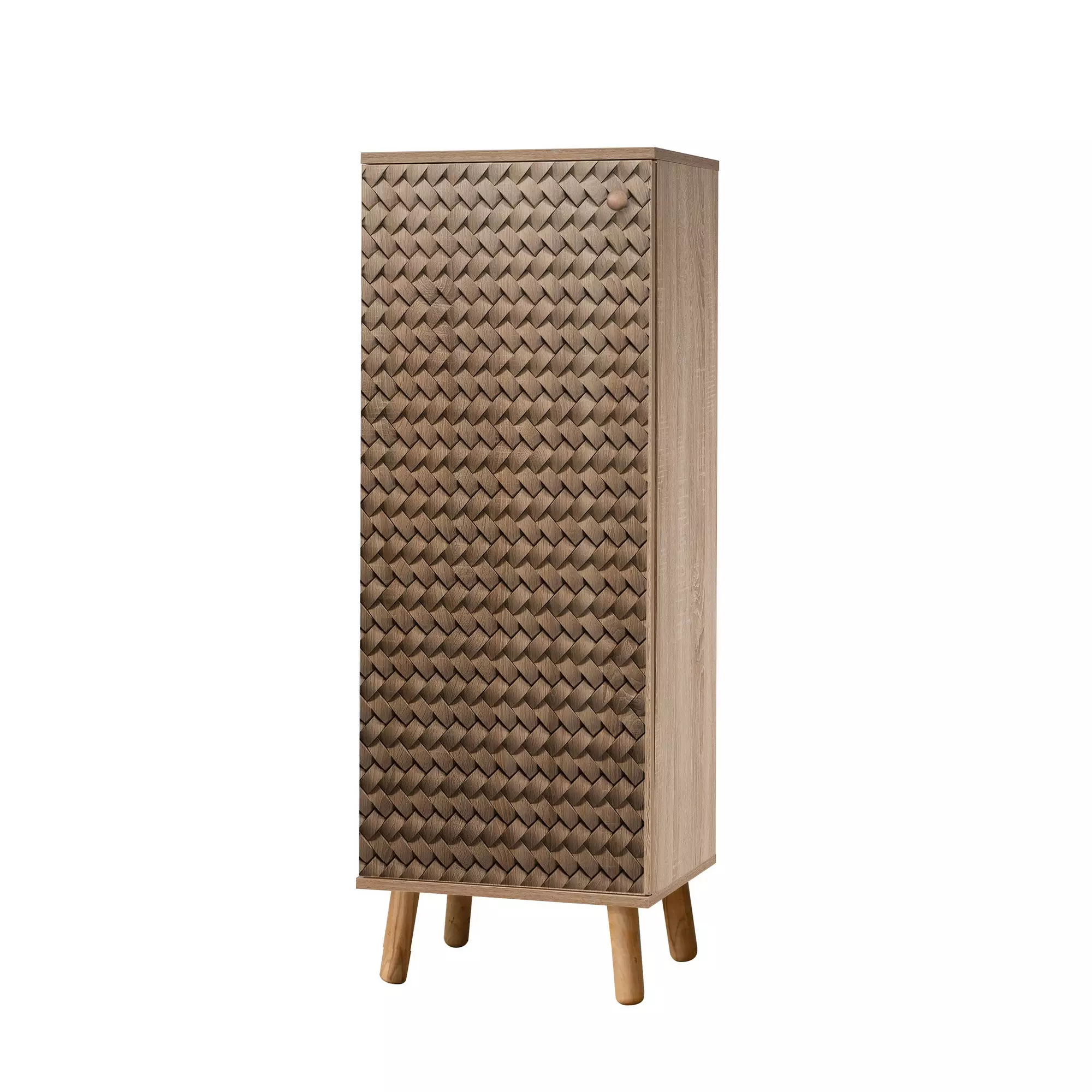 Vårt skoskåp är tillverkat av 100% melaminbelagd spånskiva, vilket garanterar hållbarhet och lång livslängd. Tjockleken på 18 mm gör skåpet extra robust och gör att det klarar vikten av flera par skor. Skåpet har ben och handtag i massivt trä, vilket ger designen en touch av elegans. Sonomo-färgen ger en varm och inbjudande känsla till alla rum.