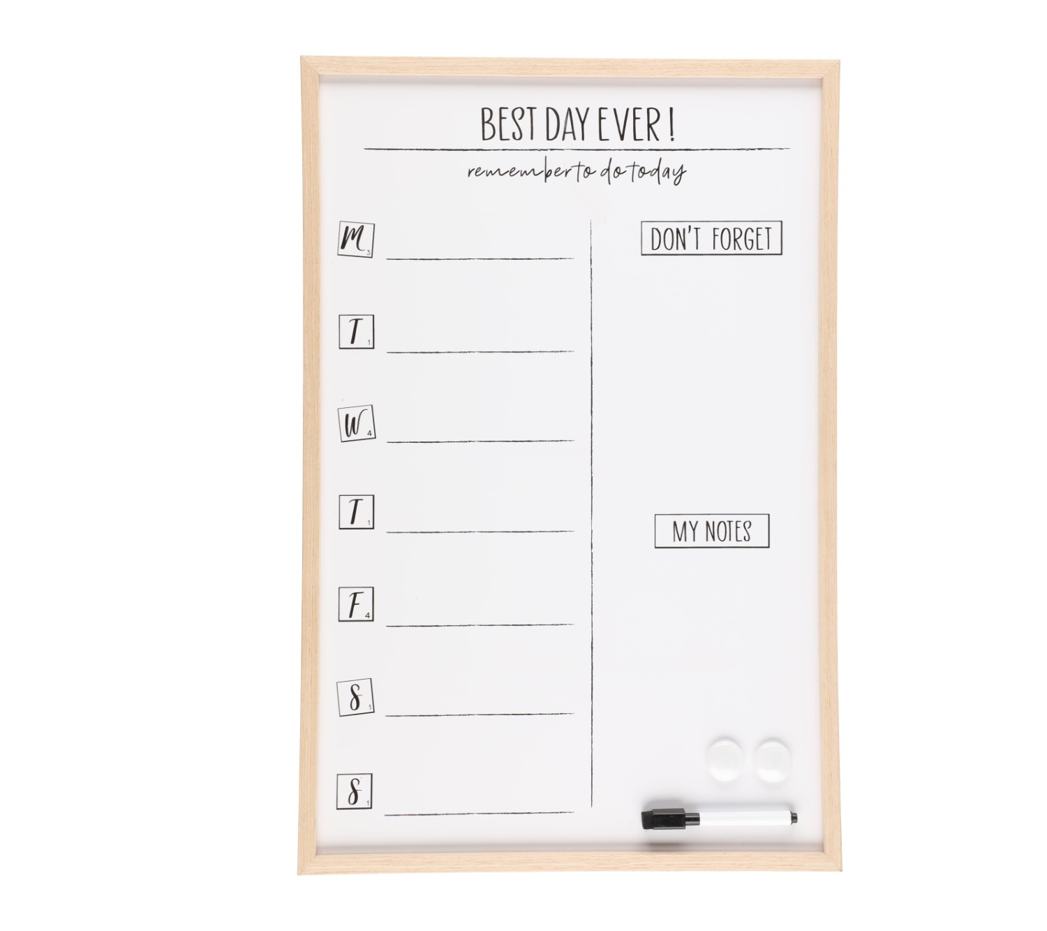 Skriv upp saker att komma ihåg för varje dag i veckan kan skrivas på den praktiska Att göra-tavlan. Kommer med penna och två magneter.