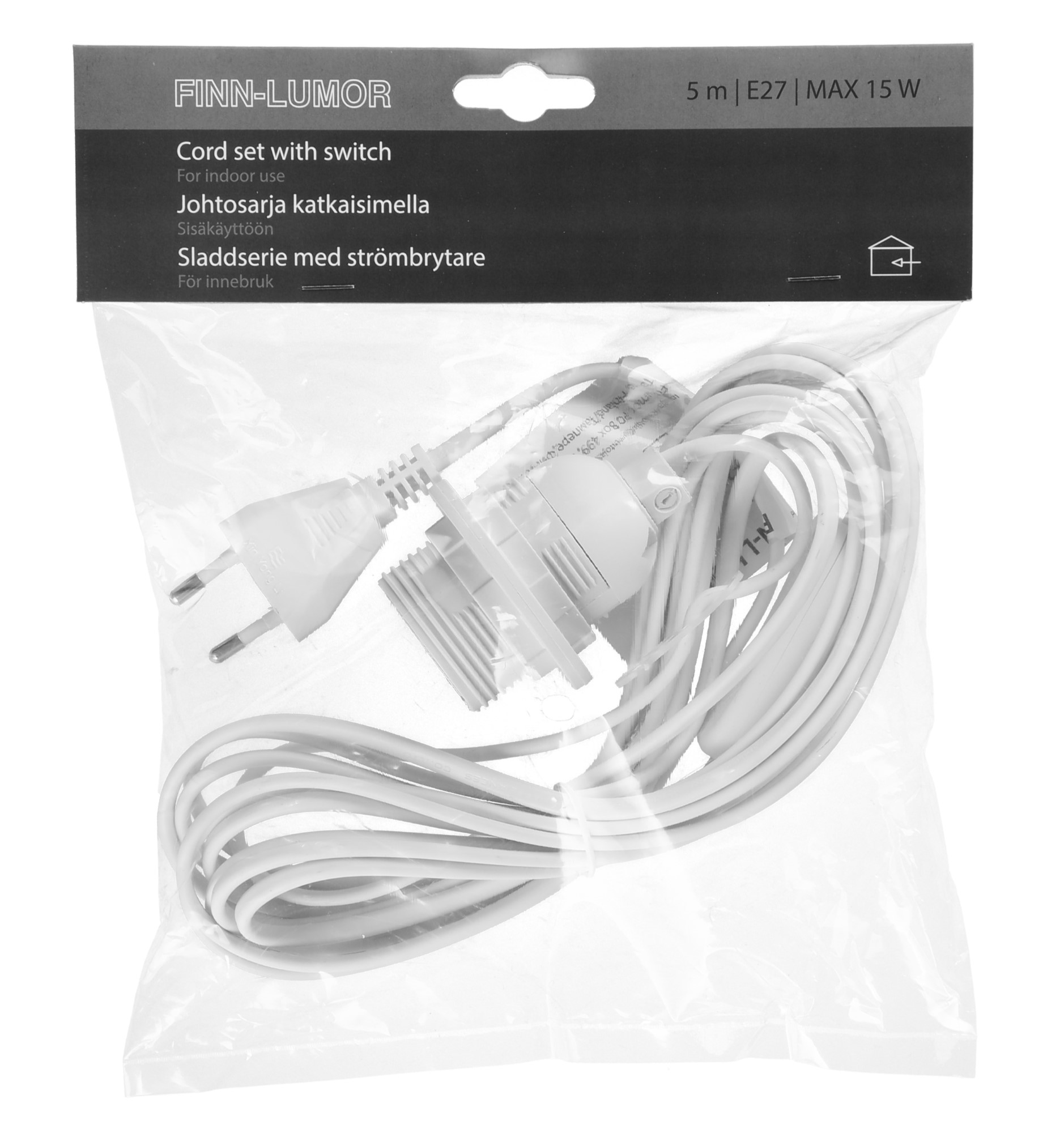 5 m långt sladdserie med strömbrytare. E27 bas. Flera användningsområden, t ex inuti en pappersstjärna eller i en globlampa. För inomhusbruk.