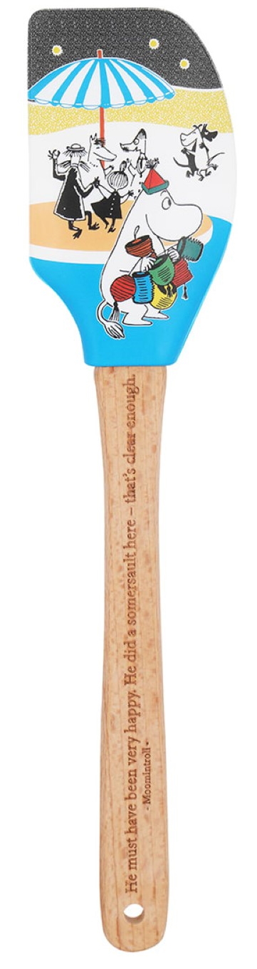 Atmosfäriskt färgsprakande medelstor slickepott med trähandtag och har en längd på 27 cm. På bilden av huvudet förbereder folket i Mumindalen sig för höstens fest.