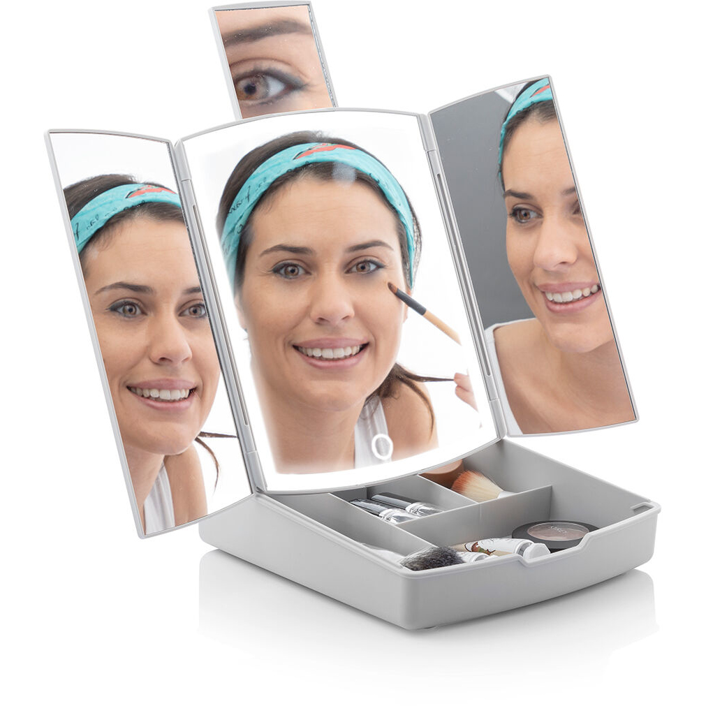 InnovaGoods Sminkspegel 3-i-1 är vikbar och utrustad med förvaringsfack. Sminkspegeln är mångsidig och justerbar. Sminkspegeln fungerar via USB-anslutning (inkluderar USB-mikro-USB-kabel) eller batterier (ingår ej). Sminkspegeln har LED-ljus med touchkontroll och 3 belysningslägen (kall, varm och dagsljus). Panoramaspegeln har en mittspegel och två sidospeglar som enkelt kan vikas och öppnas, samt en skjutbar minispegel med 7x förstoring.
