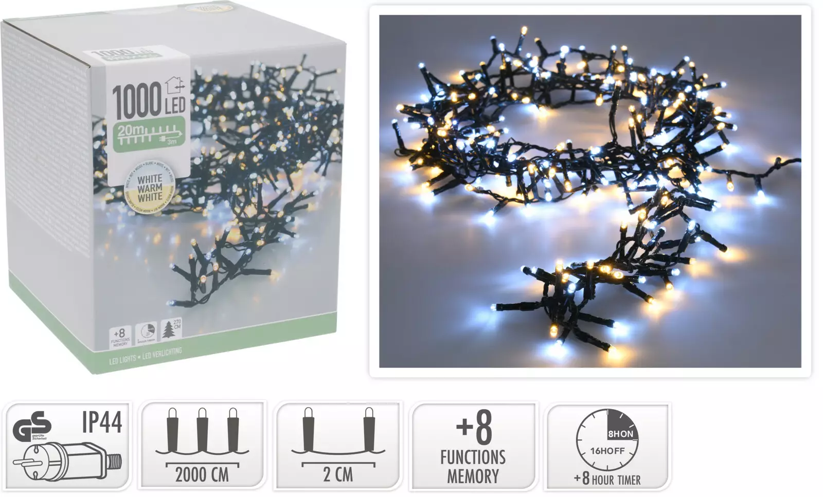 Snake LED-ljusslinga 1000 LED 20m varm och kall vit med timer för inomhus- och utomhusbruk
