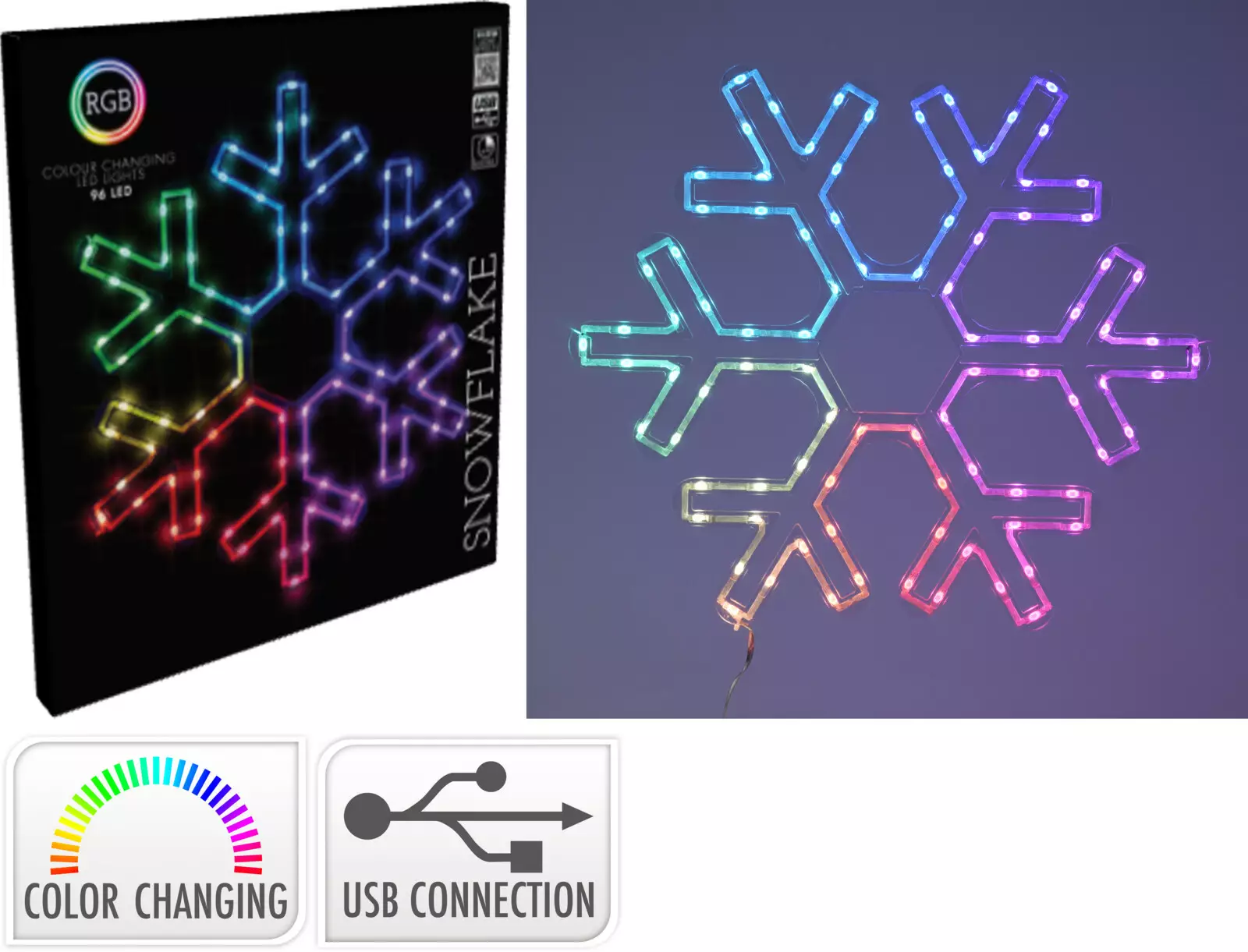 Spektakulär snöflingedekoration utrustad med RGB LED-lampor som skapar en festlig atmosfär genom att byta färger. Lämplig för både inomhus- och utomhusbruk, kommer med en USB-kontakt och kontroller.