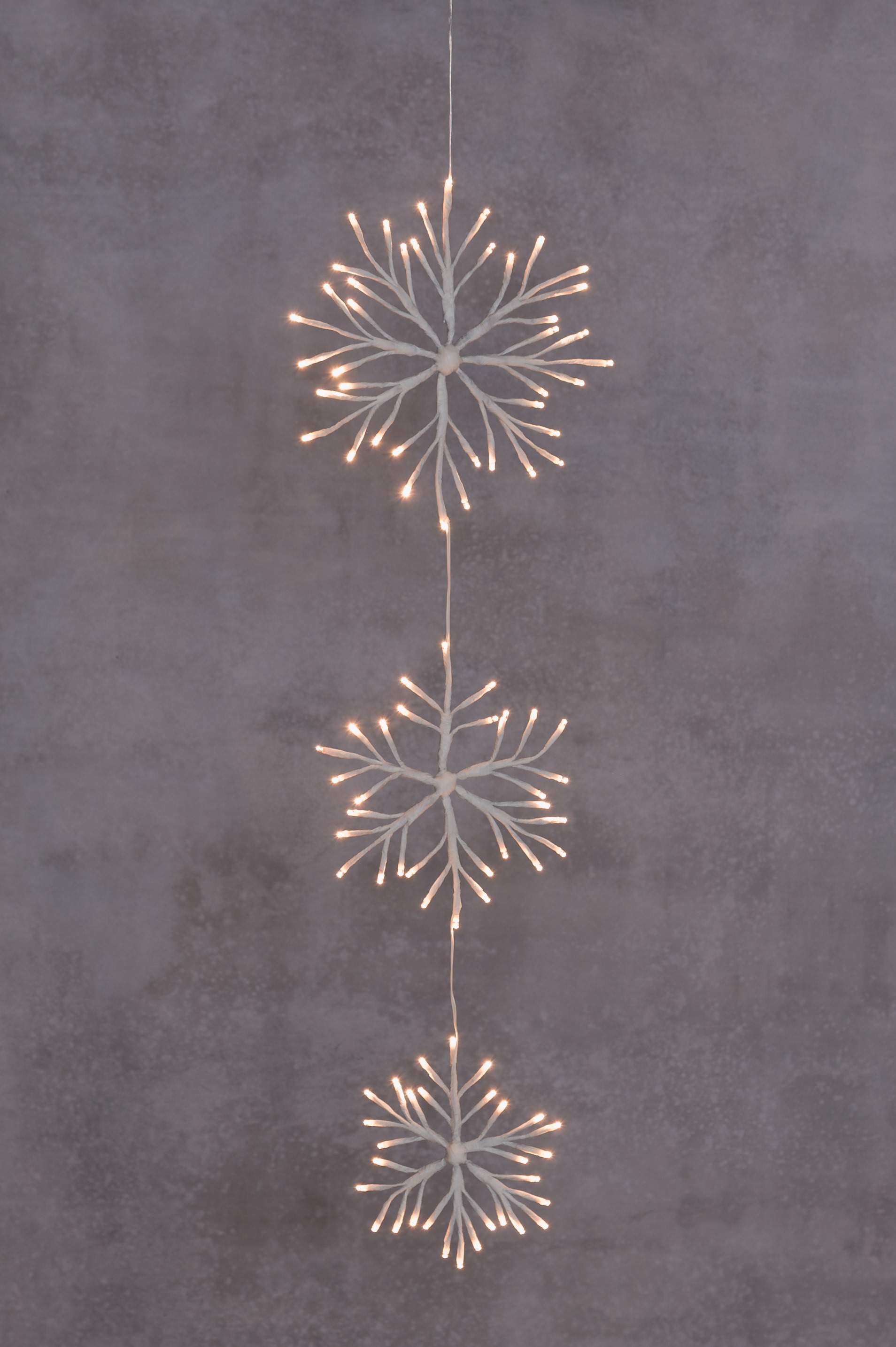 Den iögonfallande, hängande snöflingedekorationen består av tre snöflingor i olika storlekar. Storlek 30 cm/40 LED, 25 cm/30 LED och 20 cm/30 LED.
