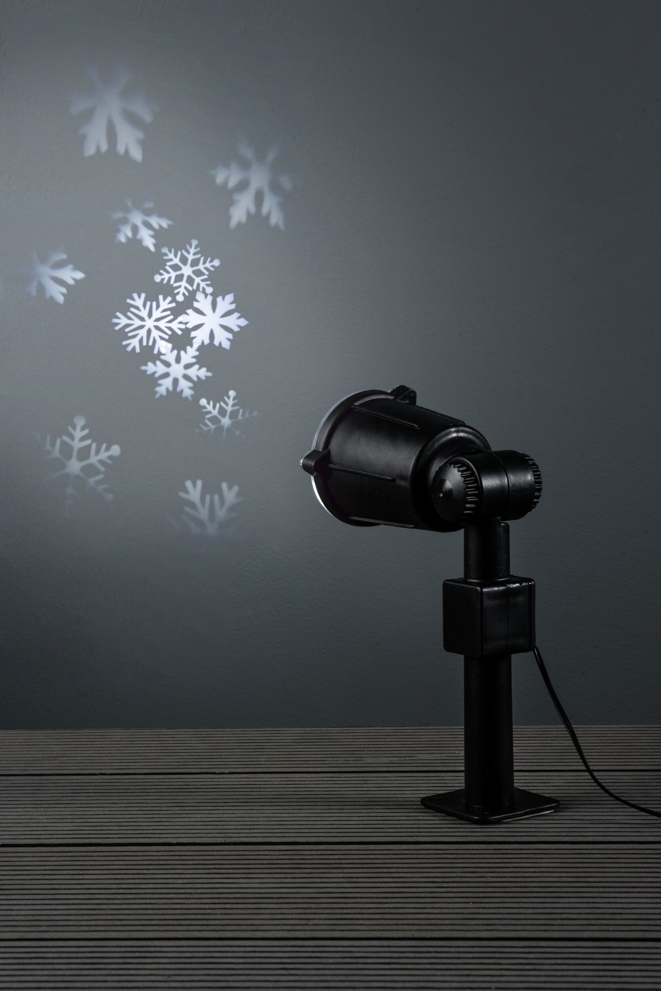 En projektor som kan användas inomhus eller utomhus under tak. Den projicerar snöflingor och stjärnfigurer med en roterande rörelse.