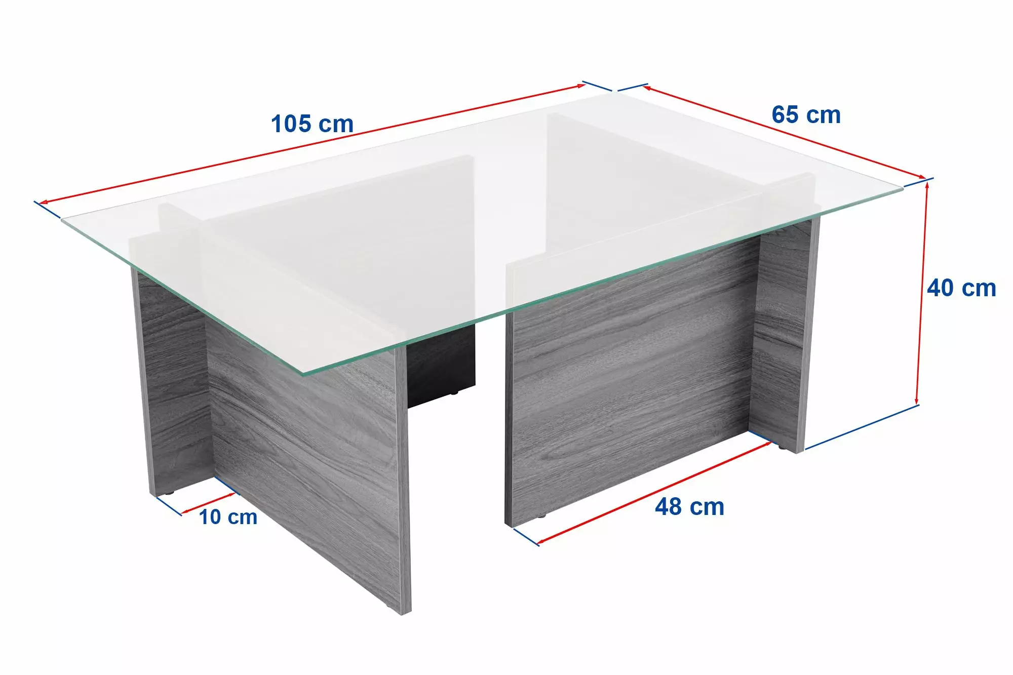 Soffbordet i grått härdat glas har en ram tillverkad av 100% melaminbelagd spånskiva, vilket ger stabilitet och stöd för glasskivan. De generösa måtten på 105 cm bredd, 40 cm höjd och 65 cm djup erbjuder gott om plats för dina böcker, dekorativa föremål och drycker, vilket gör det både elegant och funktionellt.