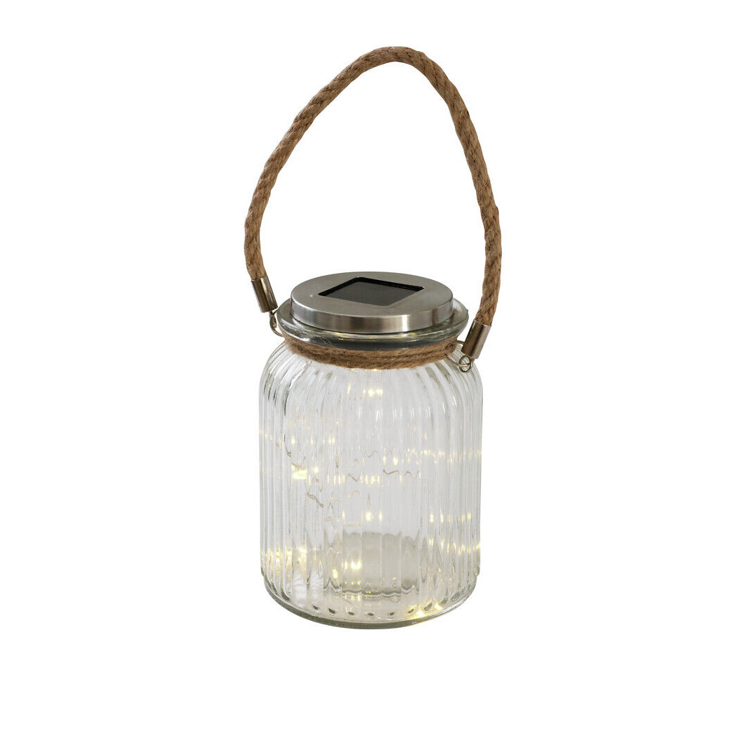 En vacker glasburk med en led-ljusslinga inuti som fungerar med solcell. Skymningsrelä. Varmvita led-lampor, ej utbytbara. Av glas, handtaget av jute. Av-/på-knapp i celldelen.