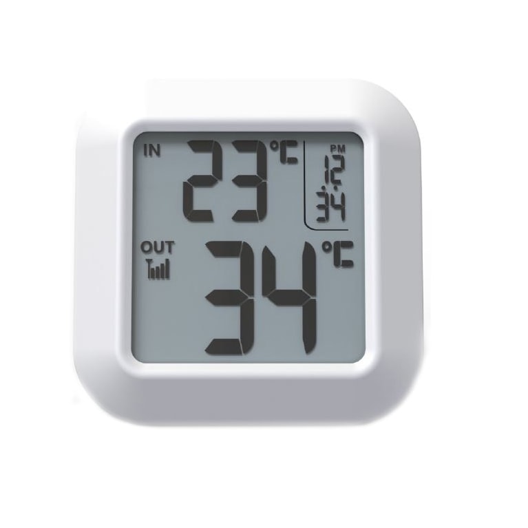 Lättanvänd och tydlig avläsning inomhus- och utomhustermometer med digital display och trådlös sensor. Du kan bekvämt installera mätaren stående på ett bord med hjälp av det integrerade stativet. Det finns även två magneter på baksidan av mätaren, som kan användas för att fästa mätaren på till exempel en kylskåpsdörr eller annan metallyta.