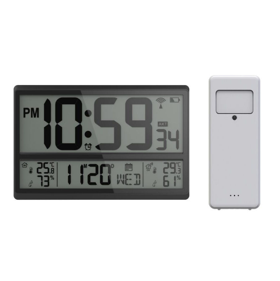 Stor digital termometer med separat sensor för utetemperatur. Du kan enkelt avläsa tiden med en blick på den stora skärmen och även ute- och innetemperaturerna och datumvisningen syns tydligt.