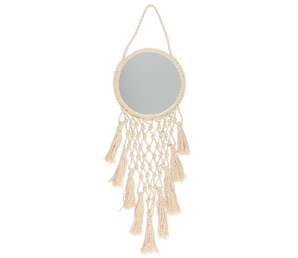 En härlig, liten macramé-pyntad väggmonterad spegel.