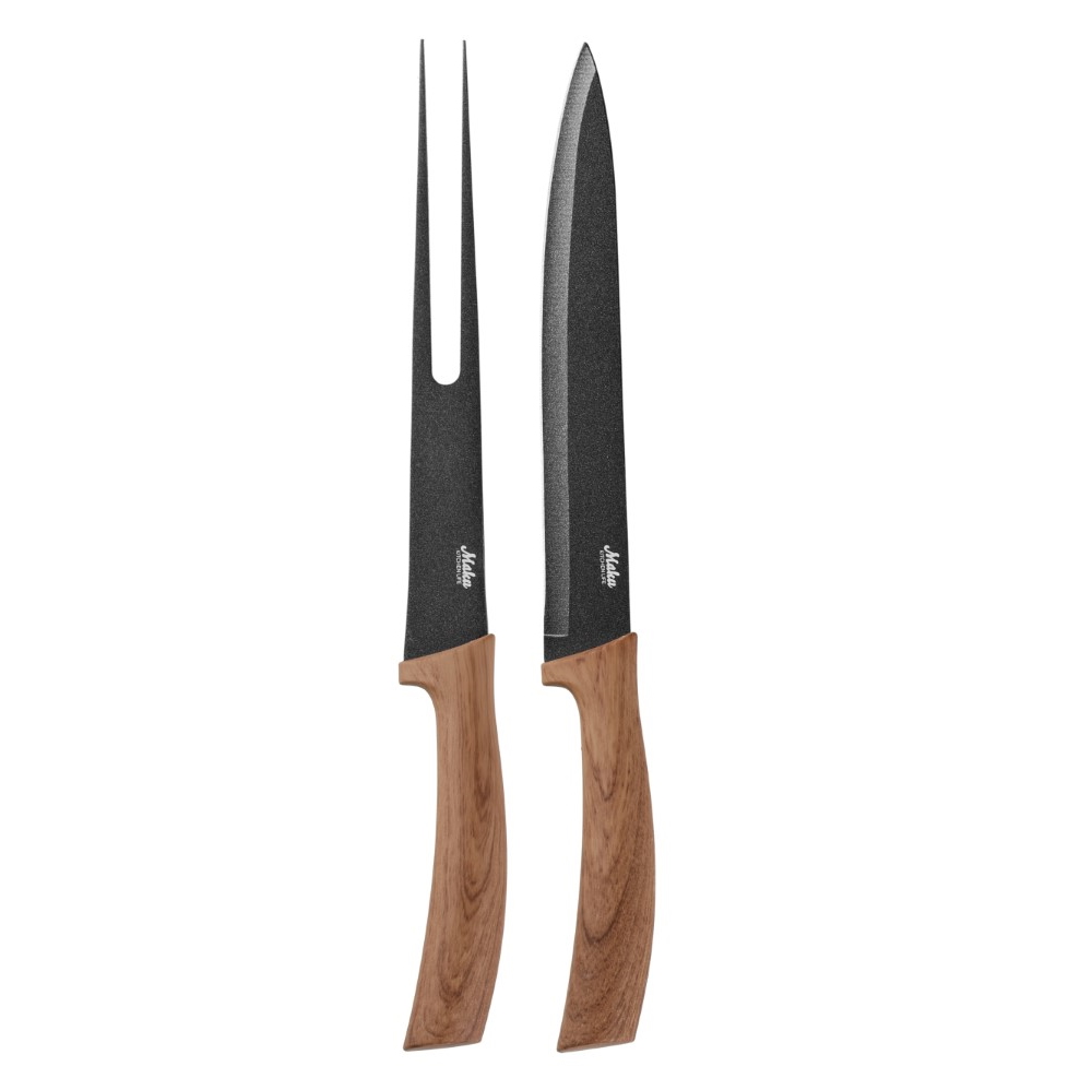 Blad av svart belagt rostfritt stål. Vacker träliknande beläggning på handtaget.