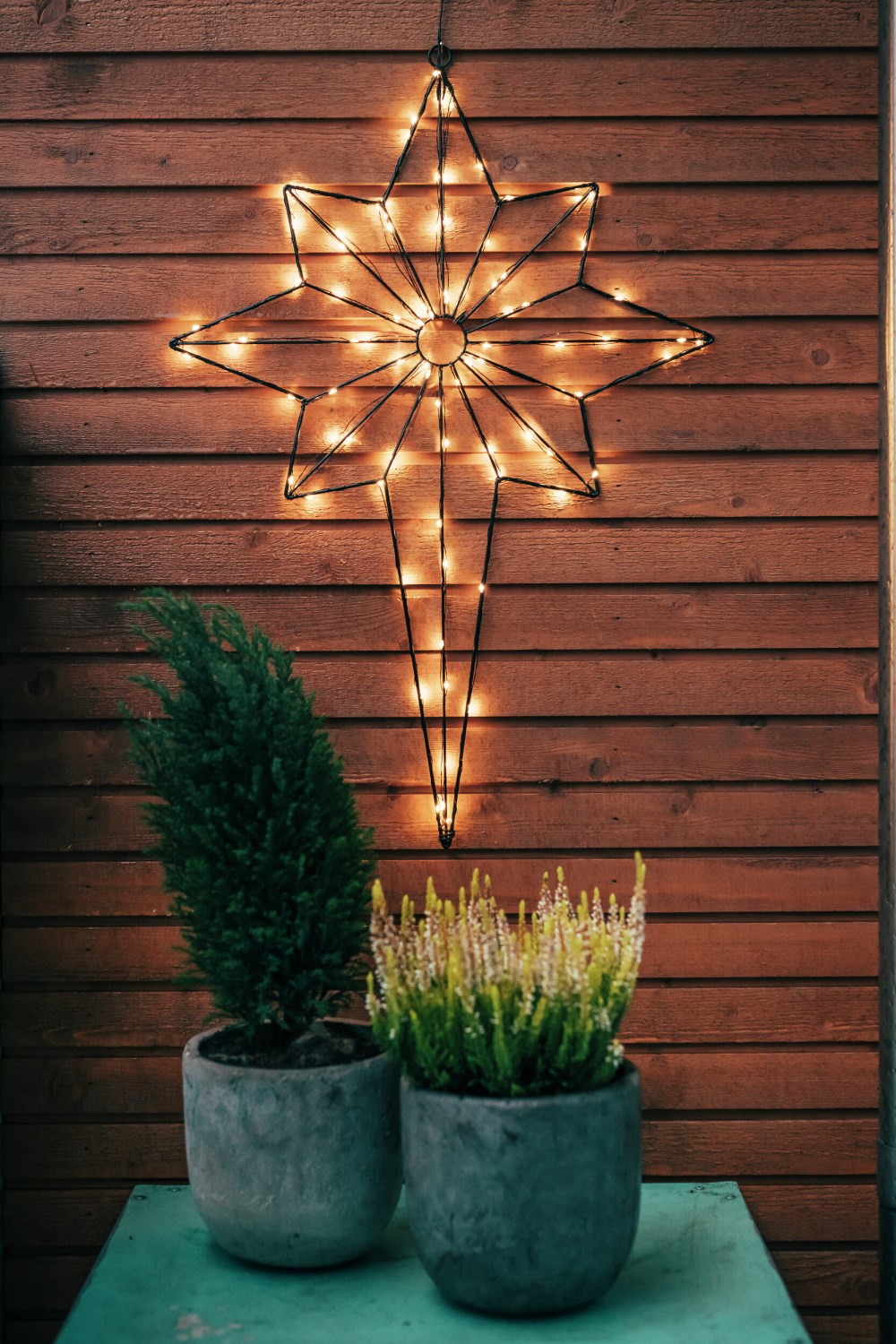 Svart stjärnstomme som lyses upp av en tunn trådslinga. Varmvita LED-lampor, ej utbytbara. Svart sladd.