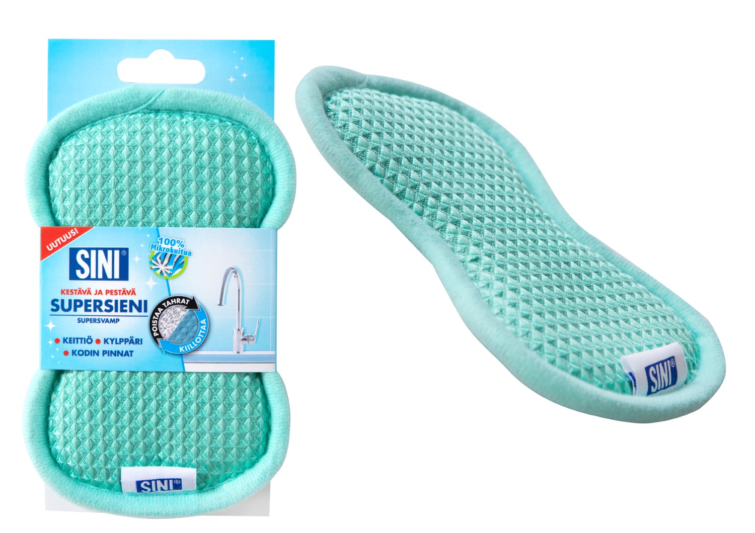 Slitstark och tvättbar supersvamp är ett universalrengöringsmedel speciellt för köks- och badrumsytor. Supersvampen har två olika sidor. Den grova sidan tar lätt bort torkade fläckar. Den mjuka sidan av svampen är lämplig för många ytor i hemmet och tar bort smuts, fett och fingeravtryck. En mikrofibersvamp rengör utan rengöringsmedel.