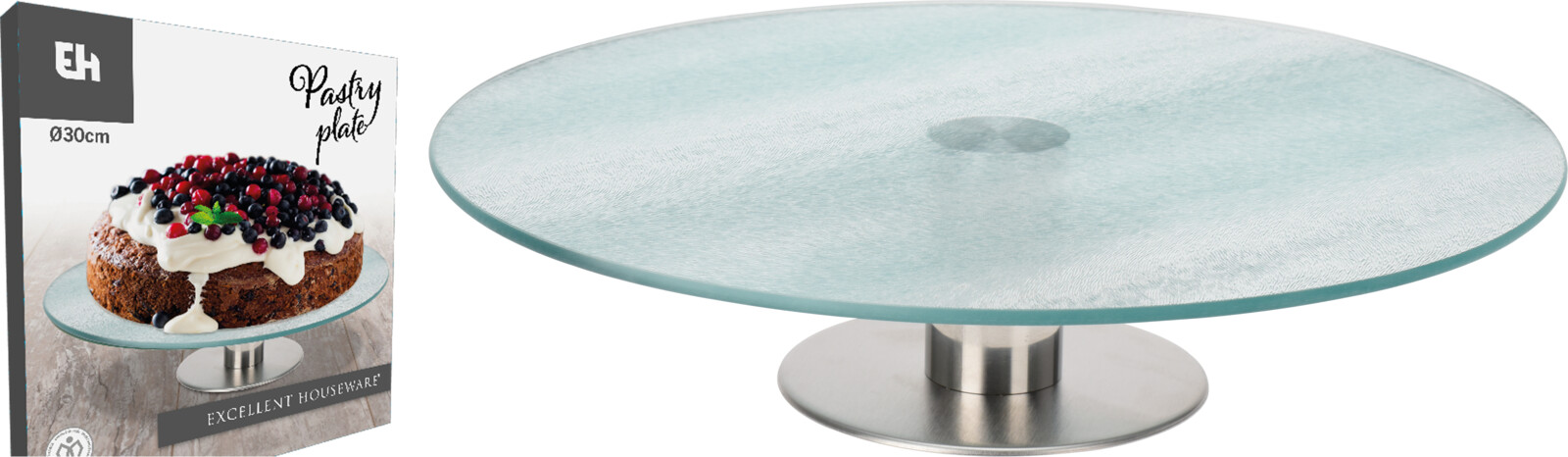En tidlös och stilren tårtfat. Glasskiva och ben i rostfritt stål.