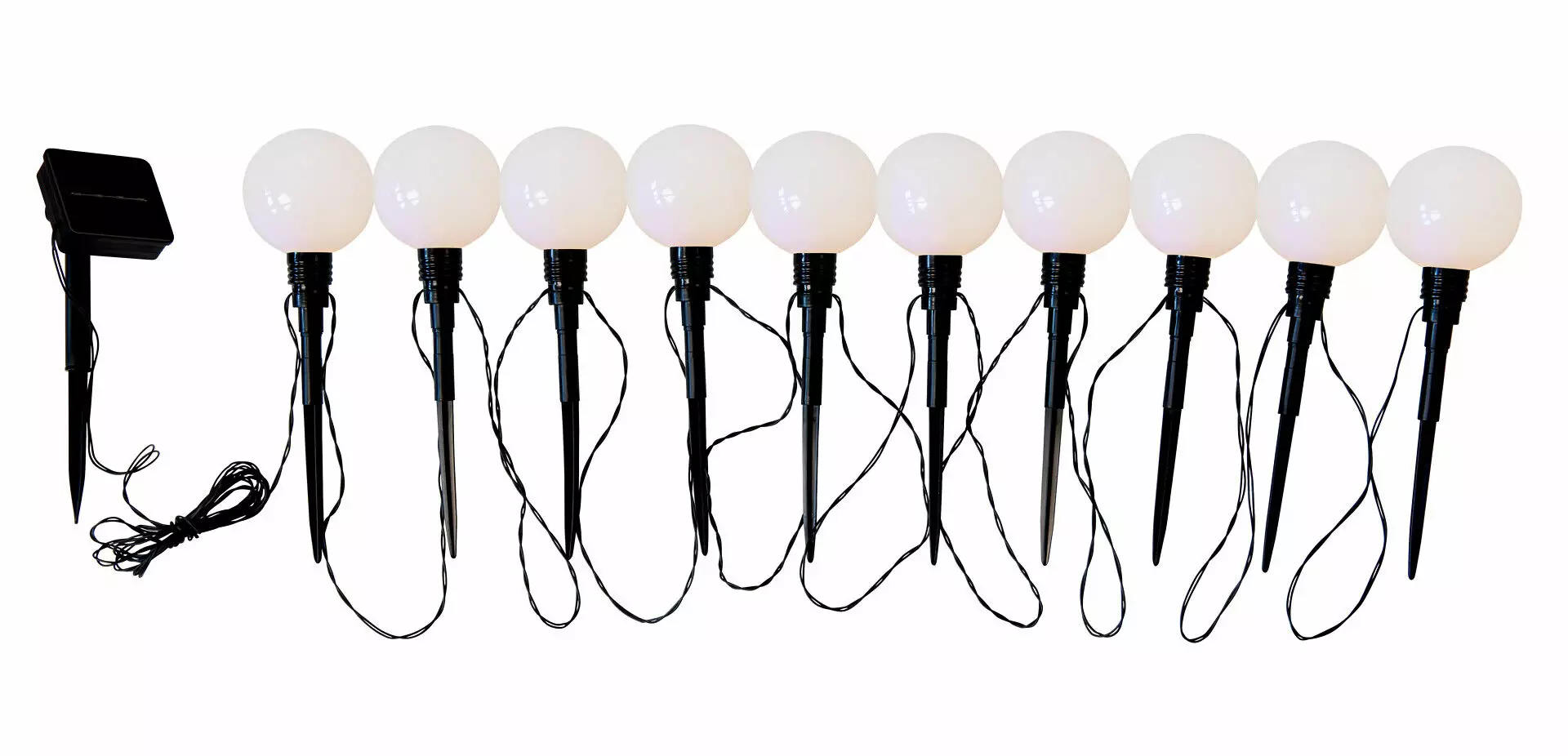 Solcellsdriven LED-trädgårdsbelysning med 10 pollare med klotformade huvuden (Ø 8 cm) som lyser i varmvitt. Placera de markspetsförsedda lamporna där du vill på gården eller i trädgården för att skapa stämning. Avståndet mellan pollarna är 50 cm och den totala längden på ljusdelen är 4,5 m.
