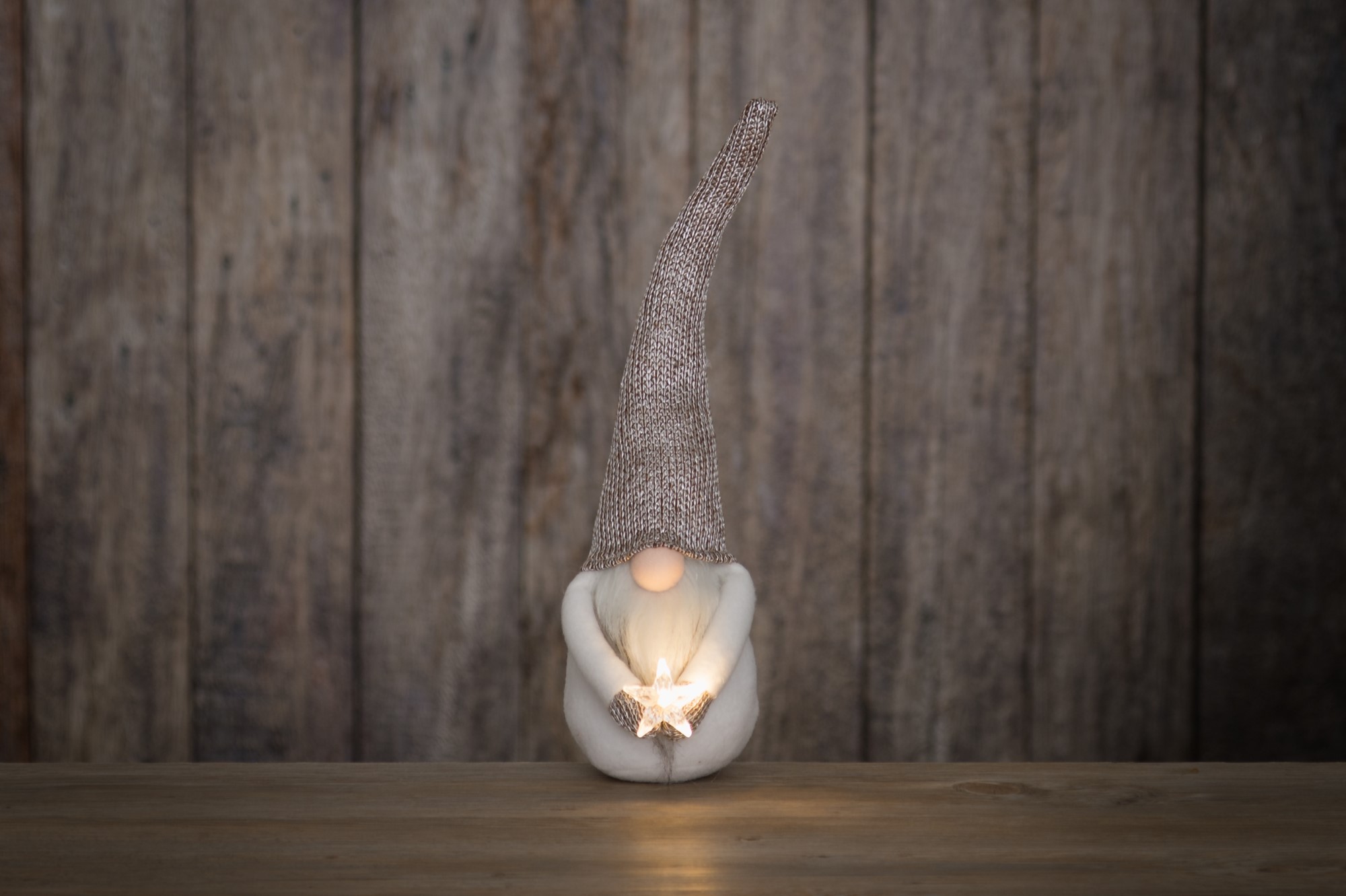 Charmiga och söta tomtar ger en varm julstämning till ditt hem. Ett kallvitt LED-ljus lyser i tomtens hand. Höjd 41 cm. Batteri 1 x CR2032 3V (ingår i paketet).