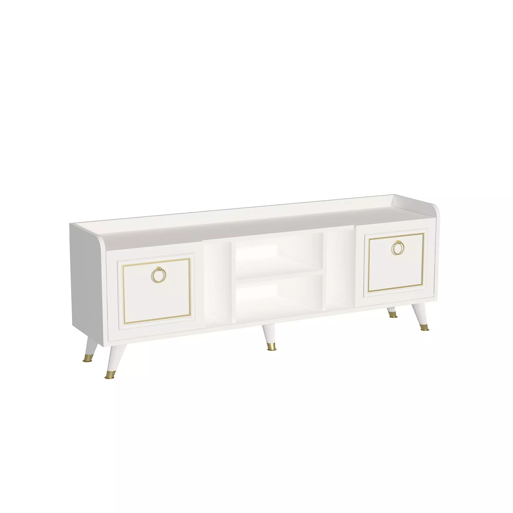 Med sin eleganta och moderna design kompletterar denna TV-enhet enkelt alla inredningar. Kombinationen av vitt och guld ger en touch av överdåd och skapar en atmosfär av lyx och förfining i ditt vardagsrum.