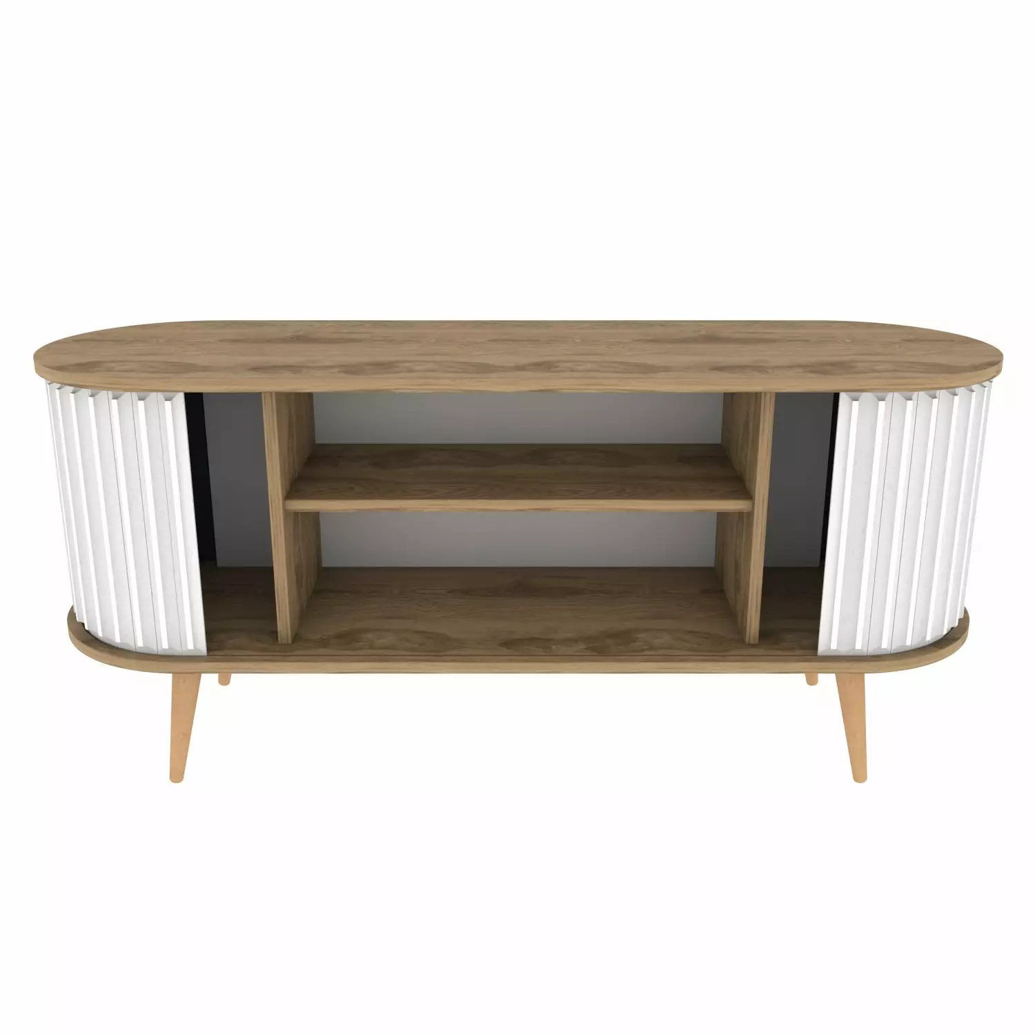 Detta TV-stativ är tillverkat av 100% melaminbelagd spånskiva och utstrålar hållbarhet och elegans. Dess eleganta och rena linjer, i kombination med den perfekta blandningen av Oud Oak och White färger, skapar en fantastisk visuell effekt som kommer att imponera på dina gäster och lämna dem i vördnad.
