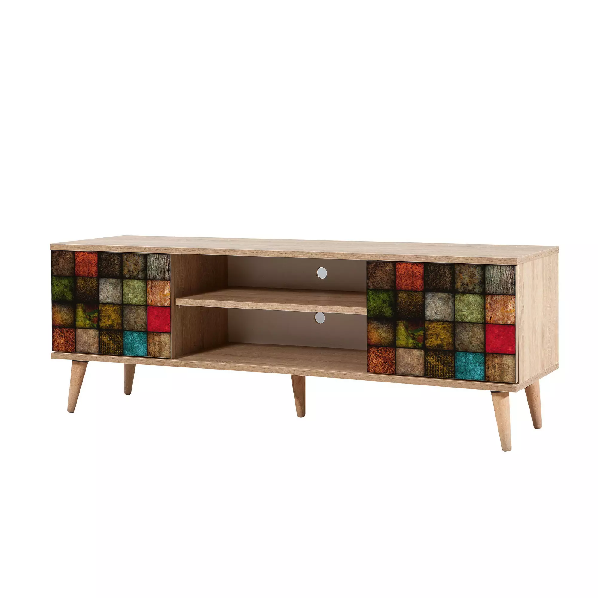 Med en fängslande blandning av kubism/surrealism, geometriska mönster och lapptäcke är denna TV-bänk ett riktigt konstverk. Färgen Sonoma Oak ger värme och sofistikering till alla utrymmen, vilket gör det till ett perfekt tillskott till ditt hem.
