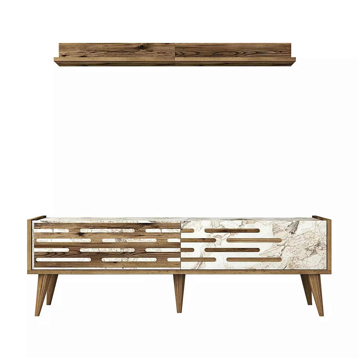 Den här TV-enheten har en elegant design och kompletterar enkelt alla inredningar. Kombinationen av valnöt, vitt och marmor ger en touch av sofistikering och elegans till ditt vardagsrum.