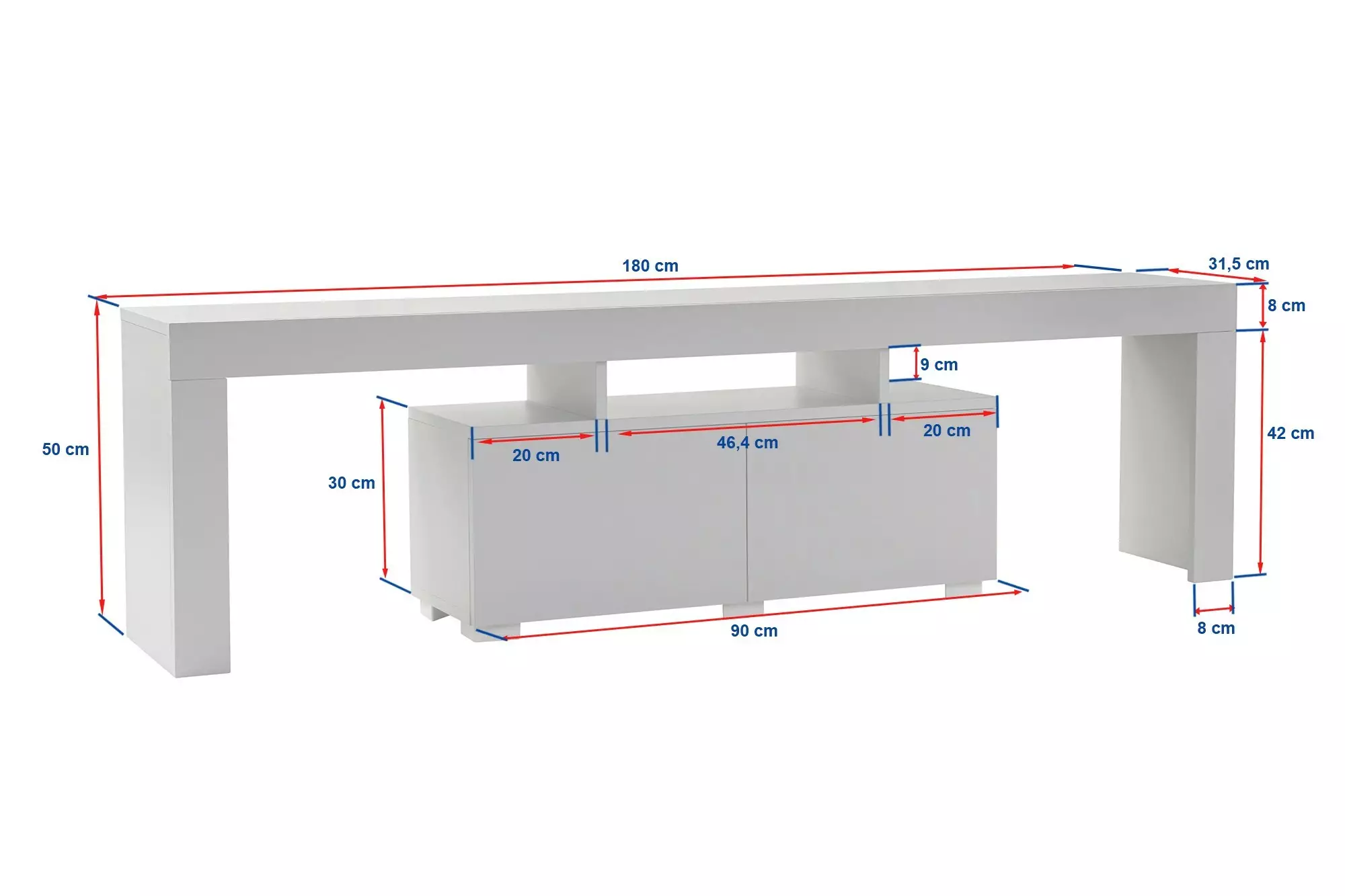 Detta tv-stativ är tillverkat med precision och uppmärksamhet på detaljer och är byggt för att hålla. Spånskivans tjocklek på 18 mm garanterar stabilitet och hållbarhet, medan bredden på 180 cm ger gott om utrymme för din tv och andra medieenheter.