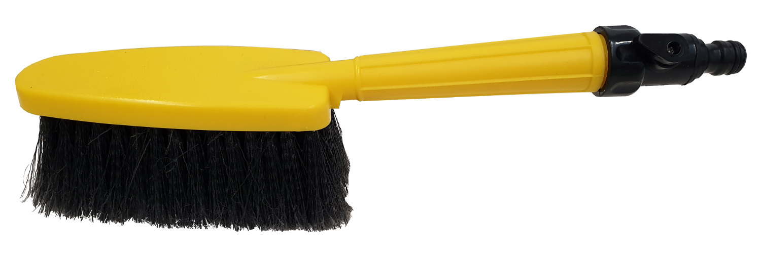 Tvättborste utrustad med snabbfäste och ventil för avstängning och påsättning av vattenflödet.