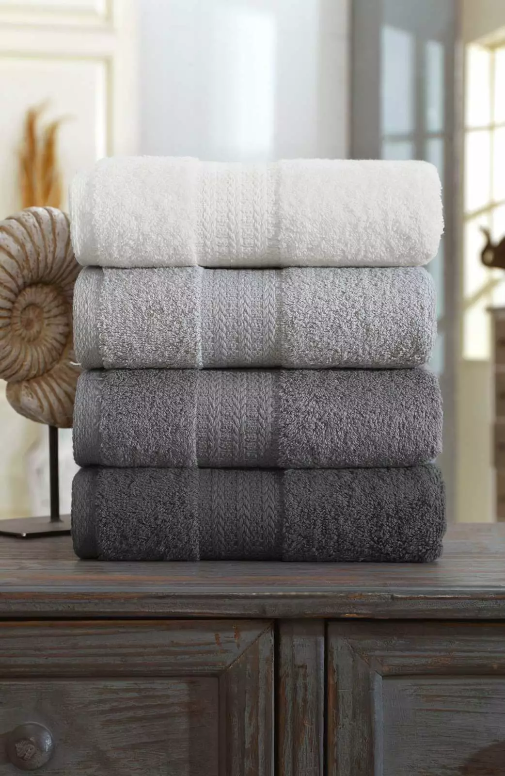 Lägg till en touch av elegans i ditt badrum med vårt set av handdukar i en stilren grå färg. Den tidlösa designen och den neutrala färgen gör det enkelt att koordinera med vilken inredningsstil som helst, medan den kvalitativa konstruktionen säkerställer långvarig skönhet och prestanda.